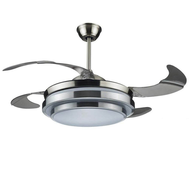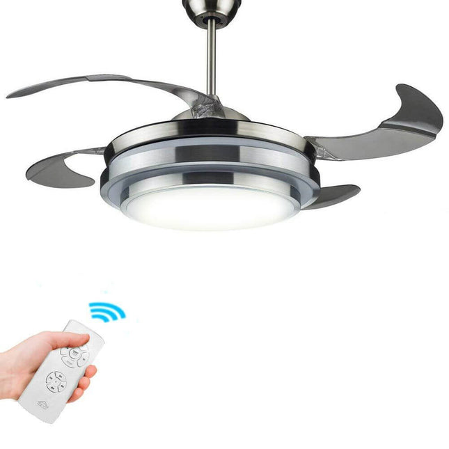 VENTILAZIONE E ILLUMINAZIONE 2IN1: Ventilatore da soffitto Ø110 cm con 4 pale richiudibili, plafoniera LED a 3 tonalità e telecomando incluso.