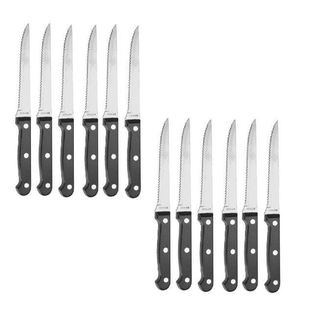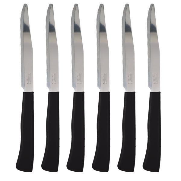 Set di 24 coltelli da tavola, lama in acciaio inox con affilatura doppia, punta affilata perfetta per carne.Seghettatura speciale per tagli netti e precisi, una comoda impugnatura in polipropilene,Adatto al lavaggio in lavastoviglie, impugnatura di colore Nero, (Lunghezza di 22 cm).