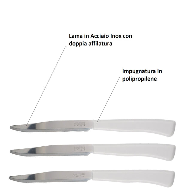 con una lama affilata adatta per bistecche, carne ecc... mentre l'impugnatura in polipropilene Bianco offre una presa comoda e sicura.