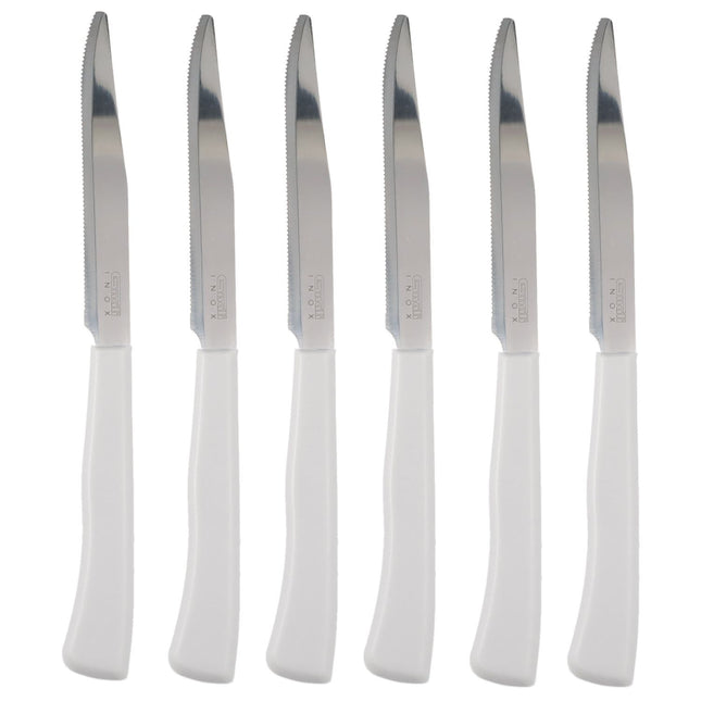 Set di 24 coltelli da tavola, lama in acciaio inox con affilatura doppia,Seghettatura speciale per tagli netti e precisi, una comoda impugnatura in polipropilene,Adatto al lavaggio in lavastoviglie, impugnatura di colore Bianco, (Lunghezza di 22 cm).