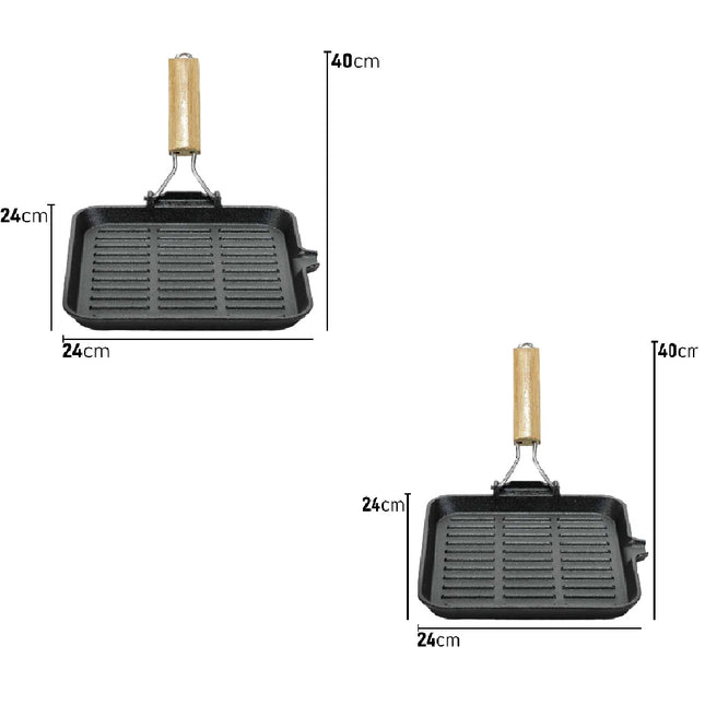 Kit 2pz Bistecchiere in Ghisa con Manico in Legno Pieghevole AntiaderenteSi adattano a Tutti i tipi di Piano Cottura anche a induzione Dimensioni 24 x 24 cm Misura con il manico aperto 24 x 40 cm Dimensioni 35 x 21 cm Misura con il manico aperto 35 x 35 cm