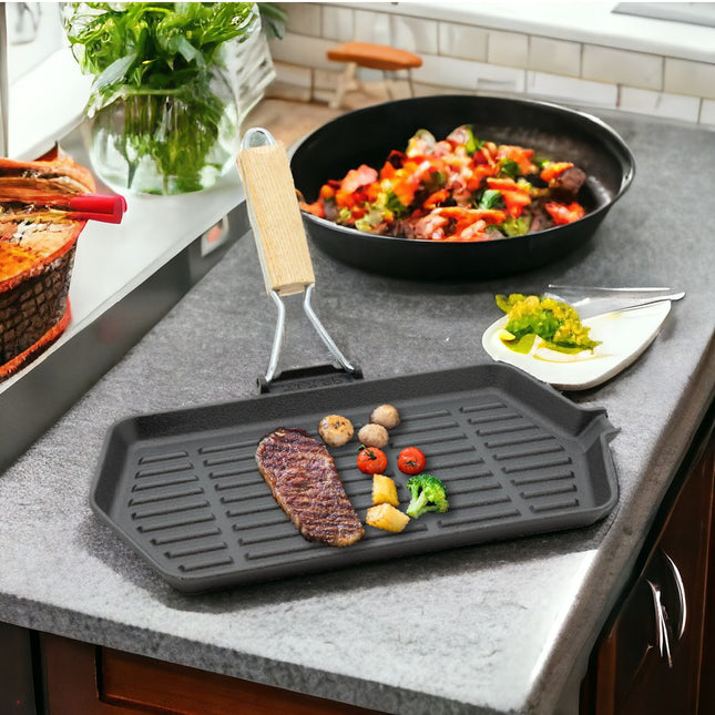 Bistecchiera in Ghisa con Manico in Legno Pieghevole Antiaderente Adatta su Tutti i Piani di Cottura Misure bistecchiera 35x21 cm Misure con manico aperto 35x35 cm