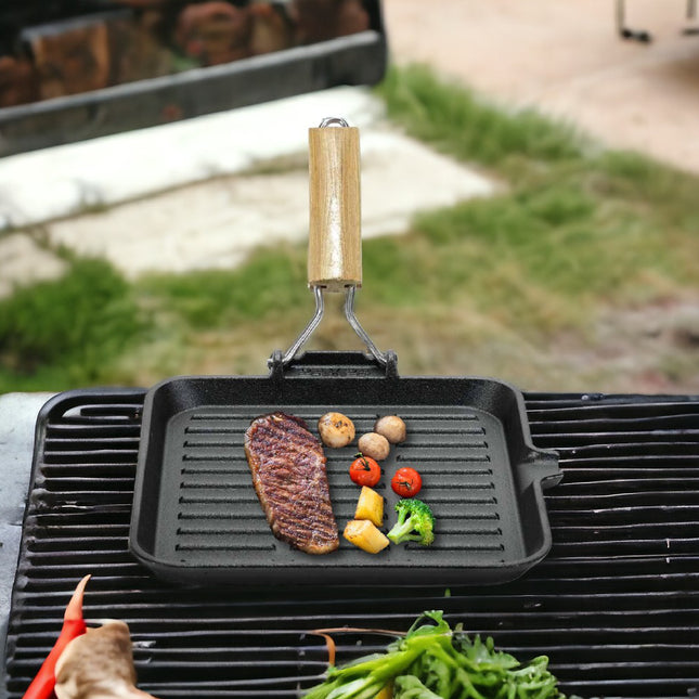 Bistecchiera in Ghisa con Manico in Legno Pieghevole e Antiaderente Adatta su Tutti i Piani di Cottura Misure 24 x 24 cmMisura con il manico aperto 24 x 40 cm