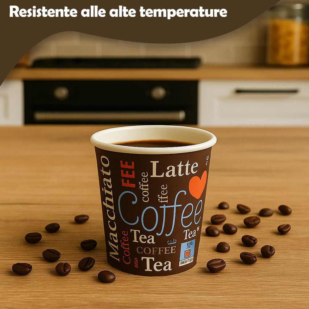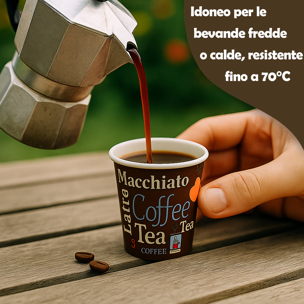 Realizzati in carta spessa e robusta, i bicchierini garantiscono un’ottima tenuta anche con caffè bollente.