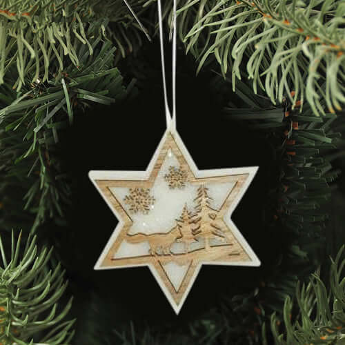 3 Appendini Natale In Legno e Ovatta Forma Stella Albero Cuore Con Scenario 16cm