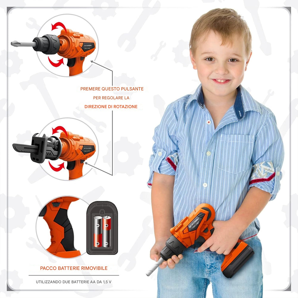 Trapano elettrico giocattolo incluso – Il trapano sicuro e realistico aiuta i bambini a migliorare le capacità motorie fini e la coordinazione mano-occhio.