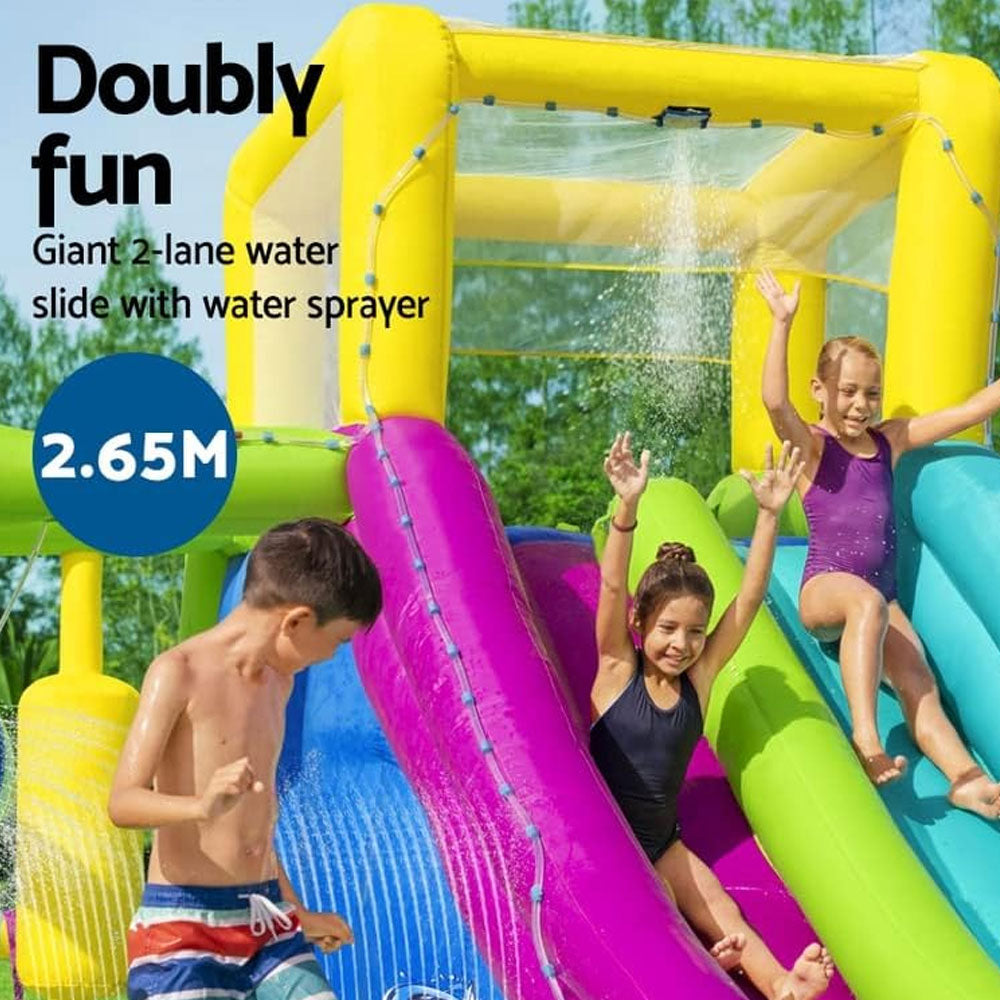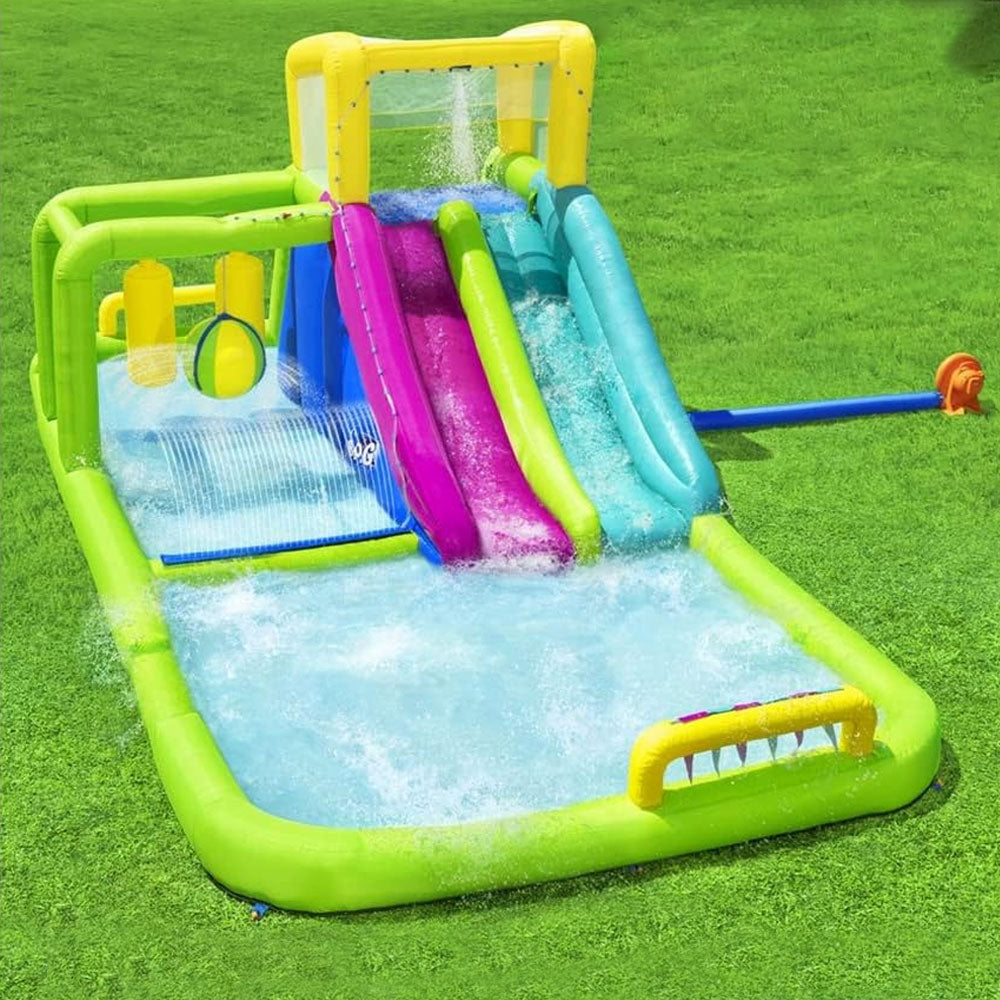 Bestway garantisce grande divertimento in giardino per molte ore. Non c'è bambino che odia lo scivolo, la piscina, i giochi d'acqua, l'arrampicata in parete e tanto altro! Il parco giochi gonfiabile fornirà tutte queste attrazioni nel tuo giardino. Niente uscite di casa, niente code e niente biglietti. Basta un giardino con superficie piana per realizzare il sogno dei bambini di avere un parco giochi tutto loro dove saltellare, calciare e giocare con gli amici. Il parco acquatico è facile e veloce da installare e montare in seguito, il ventilatore lo riempie d'aria in 2 minuti! Il colorato parco giochi è dotato di: un doppio scivolo con annaffiatoio, una cortina d'acqua attraverso la quale puoi correre e saltare, un percorso a ostacoli con sacchi da boxe e una palla lanciante. Uno spettacolare parco giochi realizzato in resistente poliestere con rivestimento in PVC, nelle dimensioni di 710 cm x 310 cm x 265 cm, sopravviverà a molti divertimenti folli. Vantaggi del parco giochi: grandi dimensioni, costruzione solida sicura per i bambini, poliestere resistente con materiale in PVC, montaggio semplice e veloce in circa 2 minuti, ventilatore (220-240 V), scivolo acquatico a 2 piste, grande piscina da gioco, costruito -irrigatore integrato per idratare lo scivolo, parete da arrampicata con maniglie e gradini, copertura in rete di sicurezza sulla parte superiore della torre, un percorso a ostacoli con sacchi da boxe, una palla e una cortina d'acqua, bandiere da corsa staccabili. Dai 5 anni in su