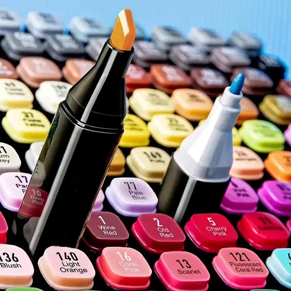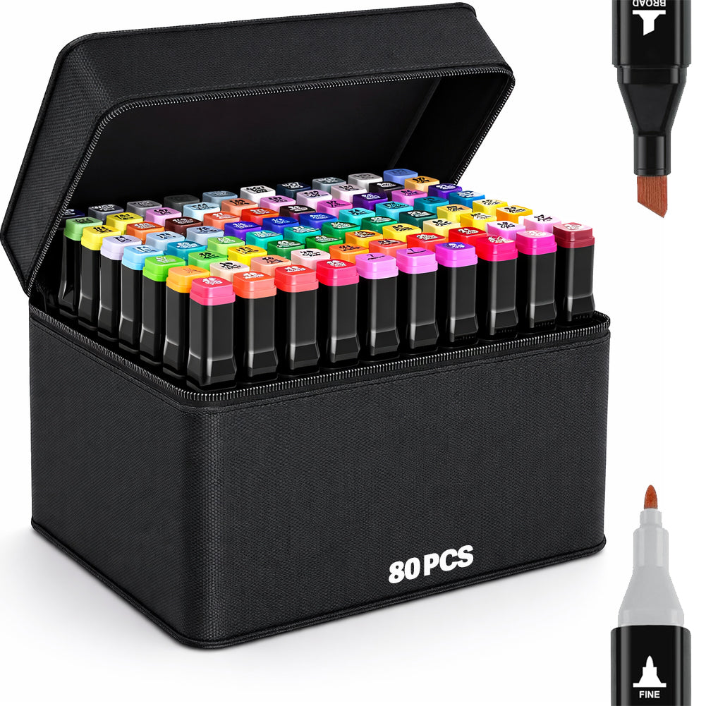 Custodia con 80 pennarelli a doppia punta inclusi, ideali per disegno artistico, illustrazione, lettering, manga e colorazione creativa.