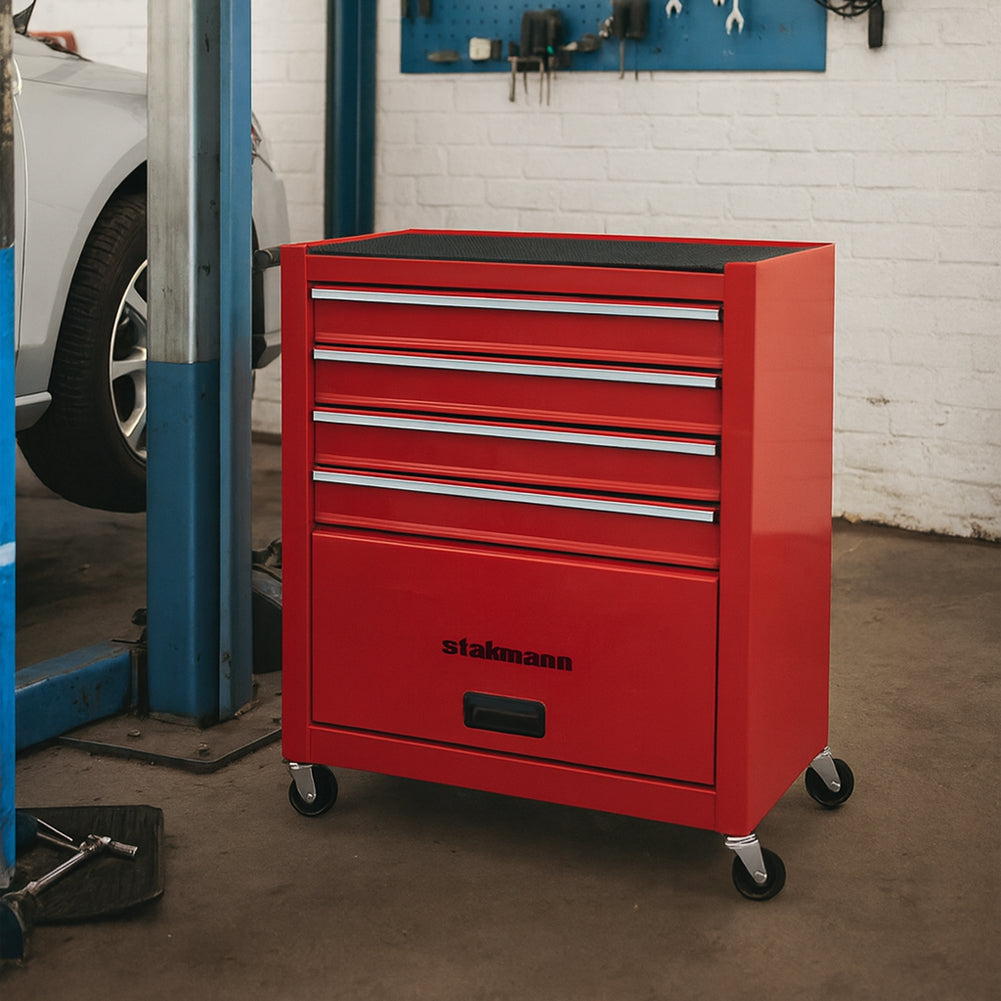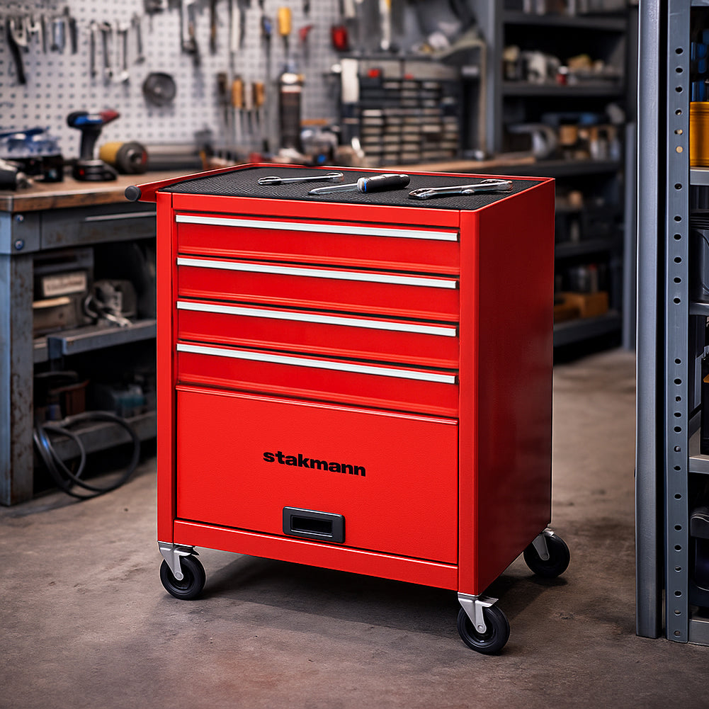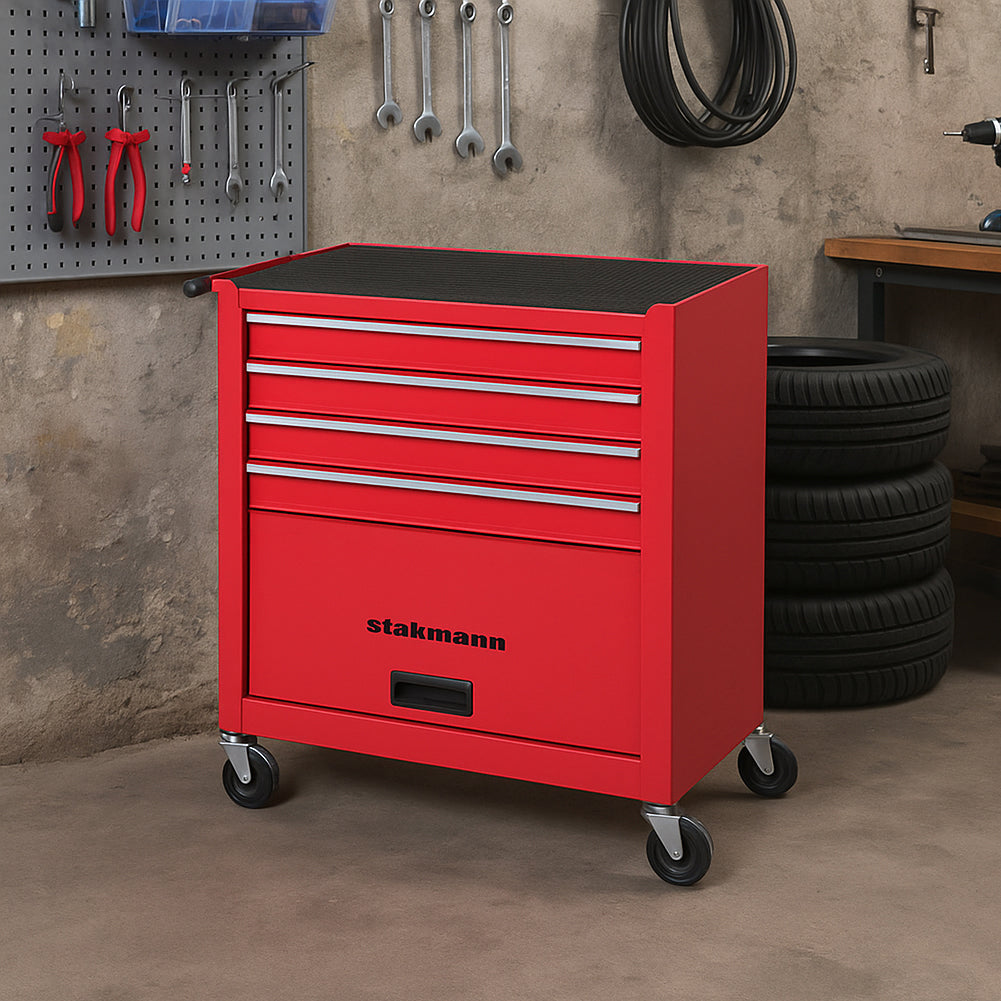 Questo carrello portautensili offre una gestione impeccabile degli strumenti grazie ai suoi 4 cassetti scorrevoli su guide a sfera con apertura totale e un vano inferiore con sportello dedicato.