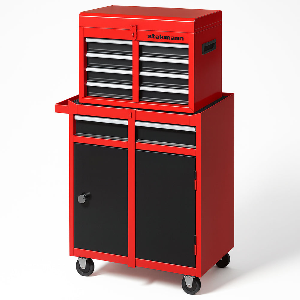 Questo portautensili integra una cassetta superiore con 4 cassetti e un ampio armadietto inferiore con sportello, offrendo un’elevata capacità di stoccaggio in uno spazio compatto.
