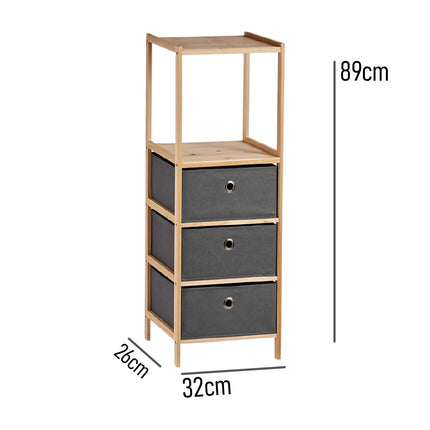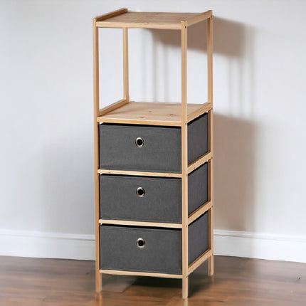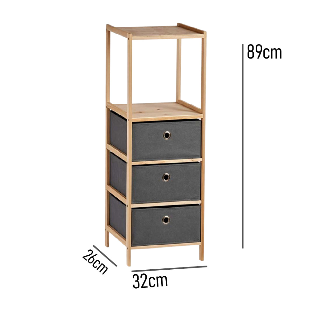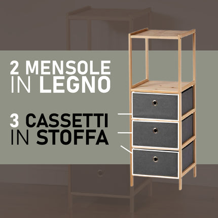 Cassettiera 3 Cassetti e 2 Mensole in Legno Naturale e Stoffa Grigio 32x26x89cm