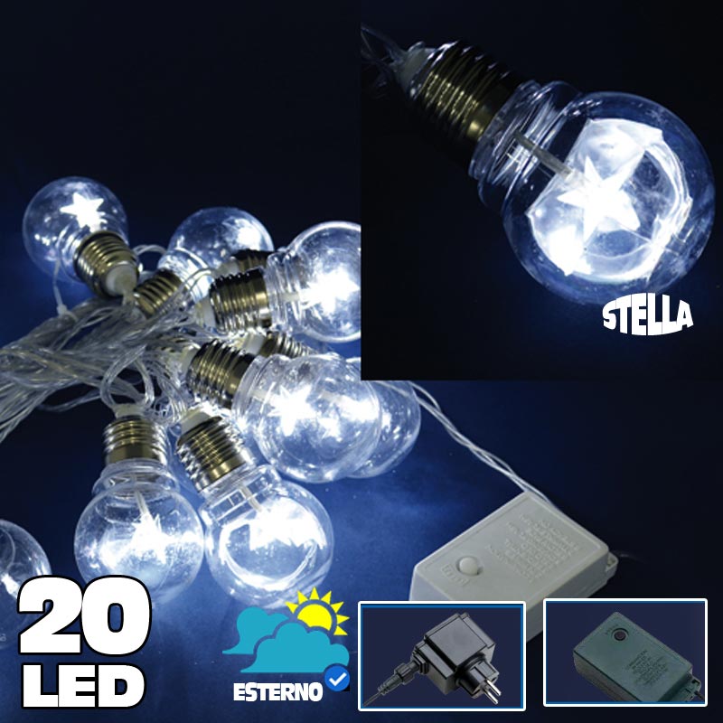 1 x Catena Luminosa 20 Bulbi forma Lampadina Trasparente a LED Bianco Freddo Stella