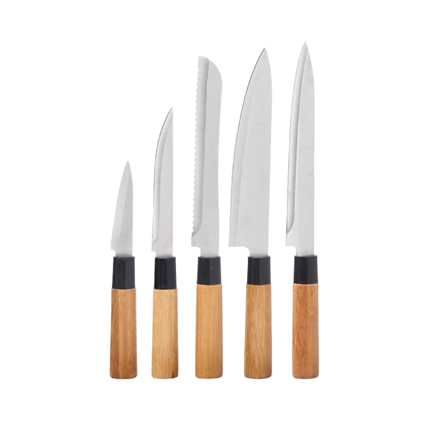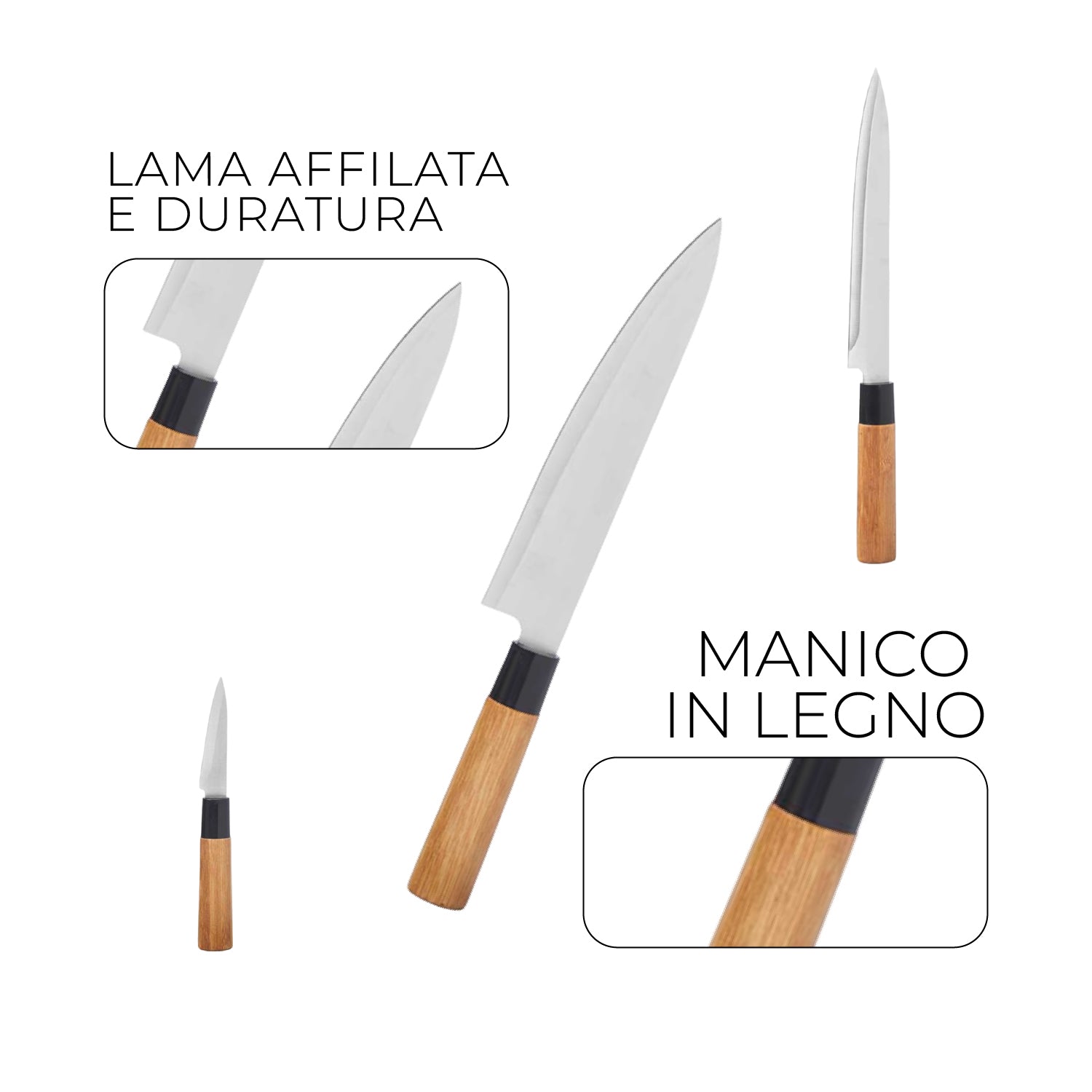 Coltelli Cucina Doppia Lama Manico in Legno Bambù Naturale kit 5pz