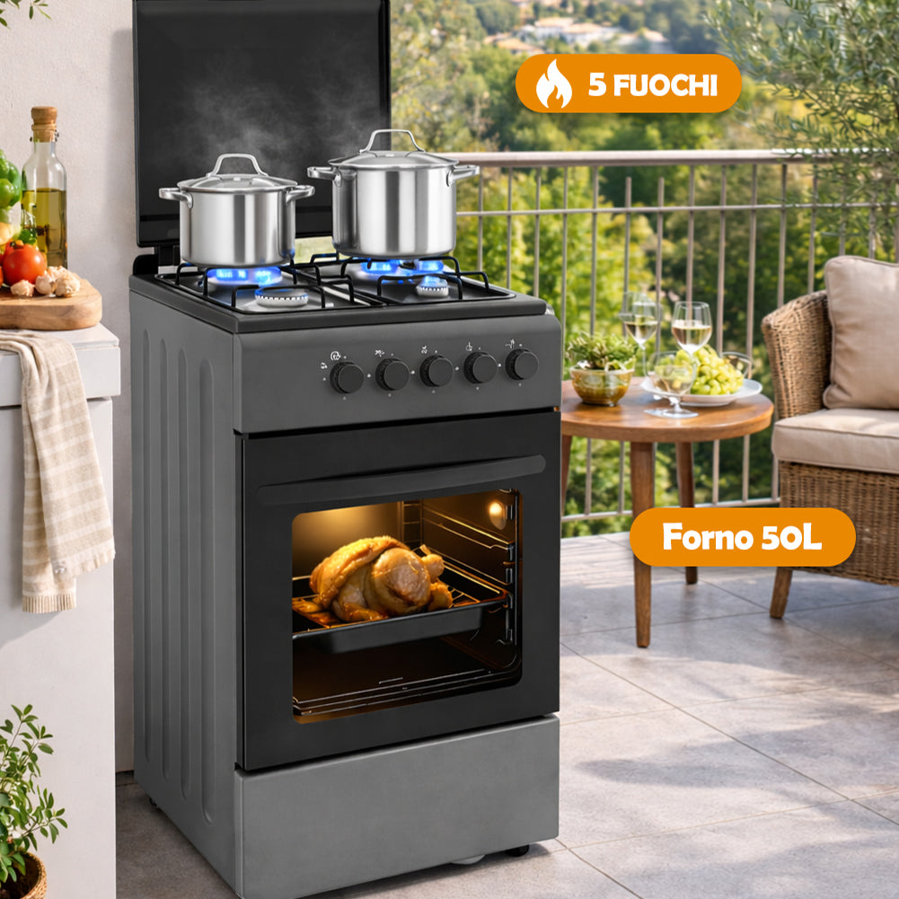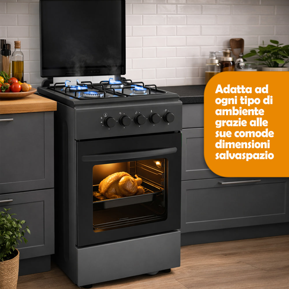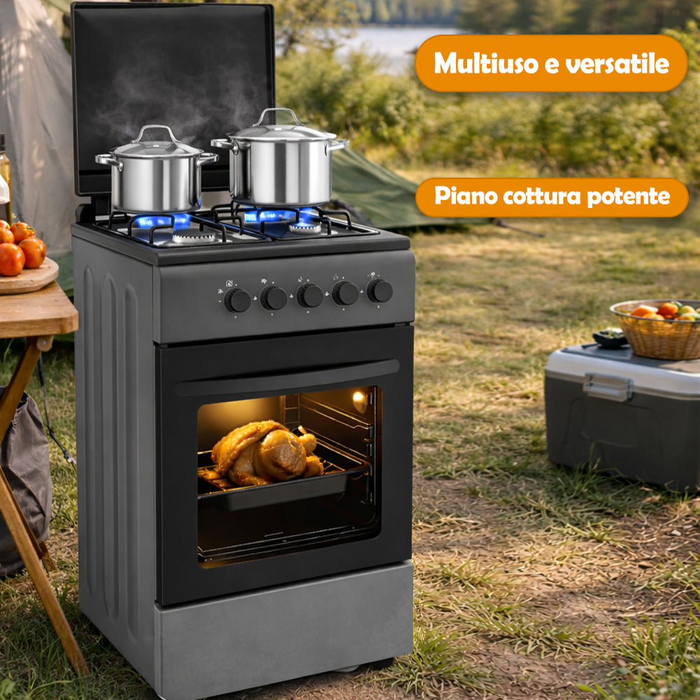 Il forno a gas integrato è dotato di termostato regolabile, pensato per garantire una cottura omogenea e affidabile.