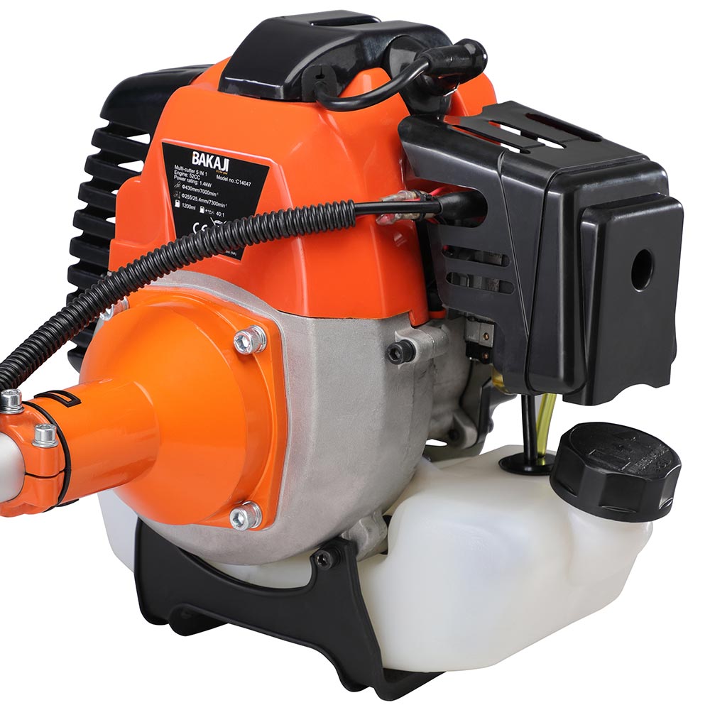 Il nuovissimo decespugliatore 5in1 a scoppio di Bakaji è fornito di un incredibile motore raffreddato ad aria dotato di accensione a rinculo e alimentato a benzina ed olio (rapporto 40:1). Questo fantastico motore eroga un incredibile potenza da 1900W che garantisce una velocità a vuoto che va dai 3000 ai 9000 rpm.