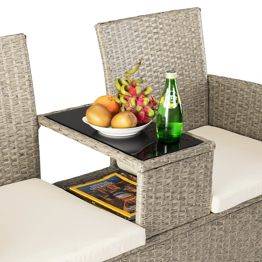 1 x Divano Panca da Giardino Crema in Polyrattan Panchina Divanetto con Ripiano Vetro da Esterno