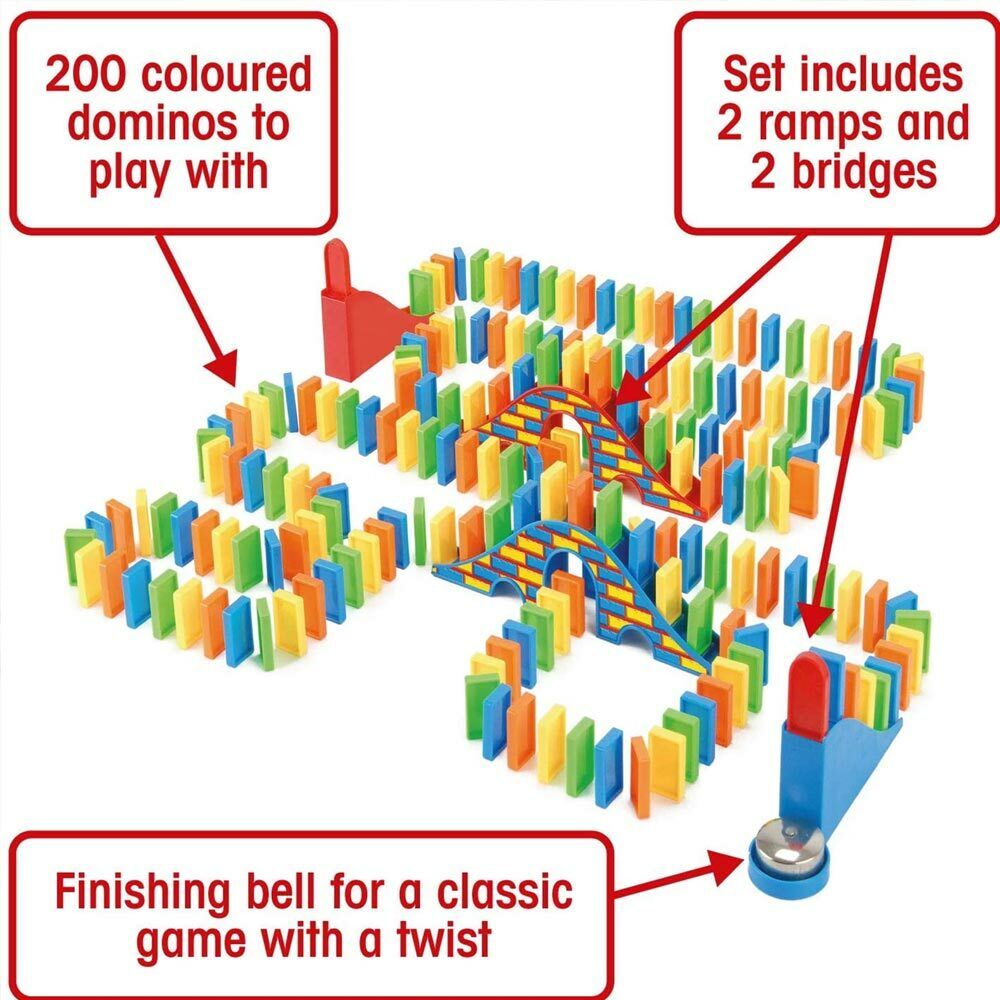 Un enorme kit di 200 tasselli domino multicolor con rampe e campanello di arrivo! Perfetto per ore di divertimento per bambini e adulti.