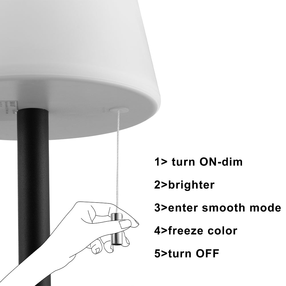 Tira due volte l'interruttore a filo per avere una luce al 100% calda, tirala di nuovo per avere un 20%, potrai inoltre tirare 2 volte per cambiare colore e 3 volte per fissare il colore da te scelto.