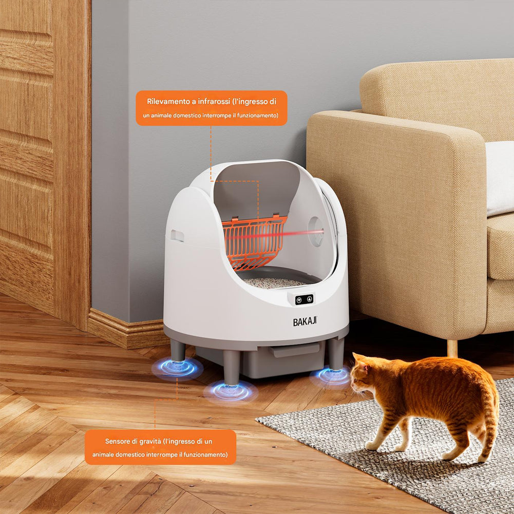 Lettiera autopulente dotata di radar sensing, sensore di gravità e sensore a infrarossi per il rilevamento del movimento.
