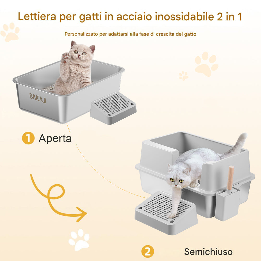 La struttura semiaperta in acciaio ospita fino a 35 litri di sabbiolina, ideale anche per gatti di taglia grande o per più felini.