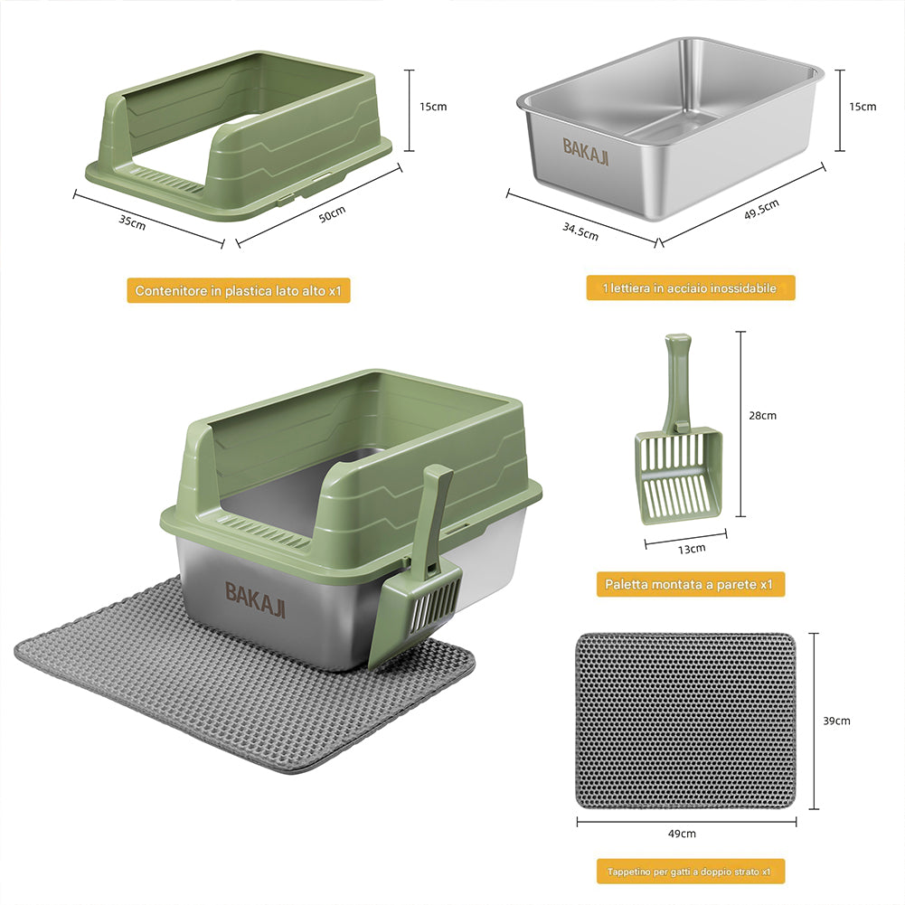 1 x Lettiera per Gatti Verde in Acciaio con Tappetino Capacità 25 Litri con Paletta