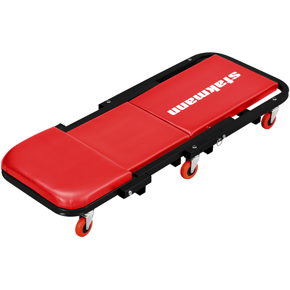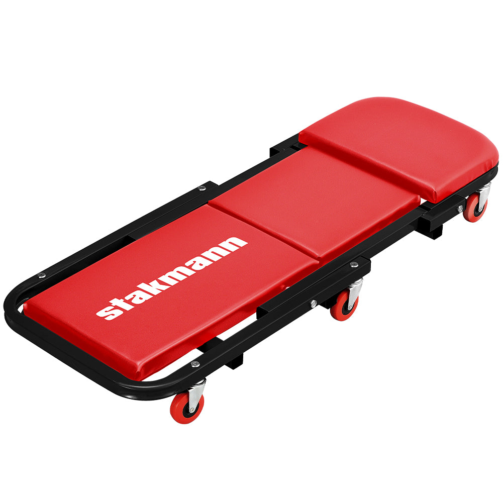 Lettino Scorrevole utile per lavorazioni sotto auto, multiuso grazie alla possibilità di piegarlo per diventare un comodo sgabello.