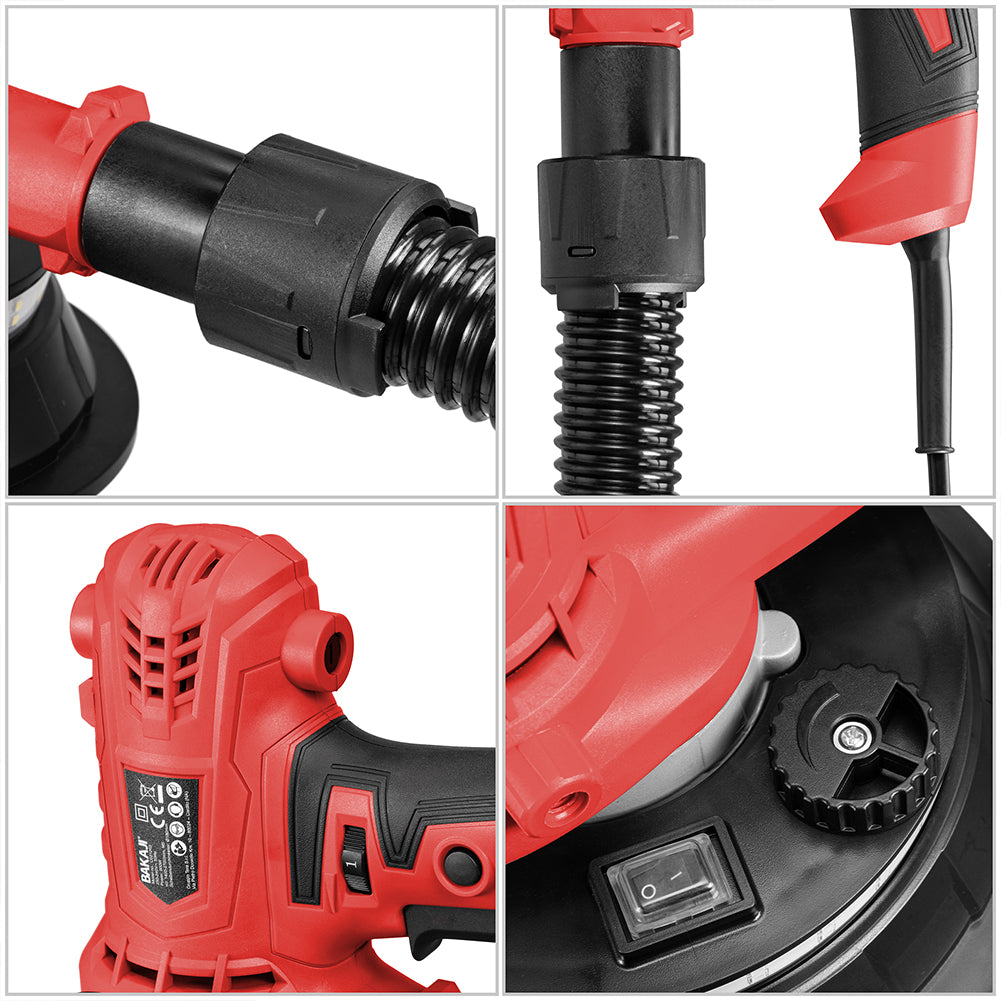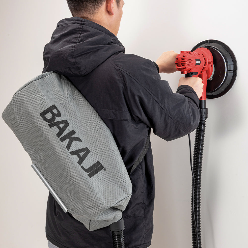 La levigatrice BAKAJI è fornita di sistema di aspirazione automatico della polvere che aspira la polvere provocata dal processo di levigatura incanalandola in un pratico sacco a zaino attraverso un lungo tubo di aspirazione di ben 2mt, ciò garantisce un lavoro di levigatura più efficiente, preciso e soprattutto pulito.