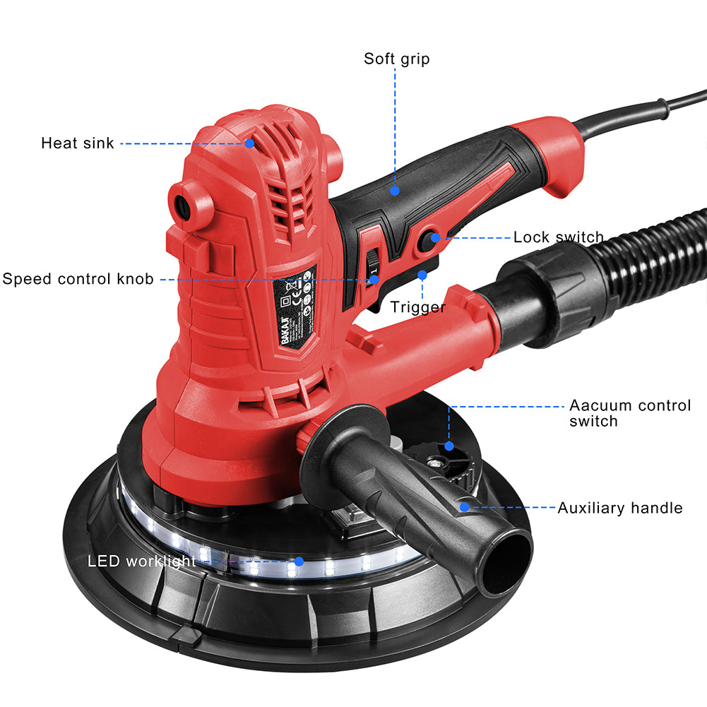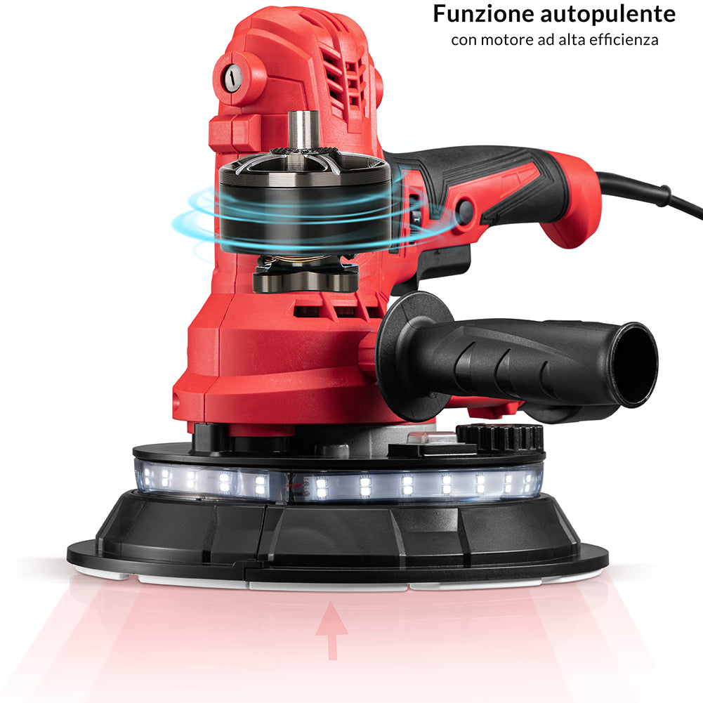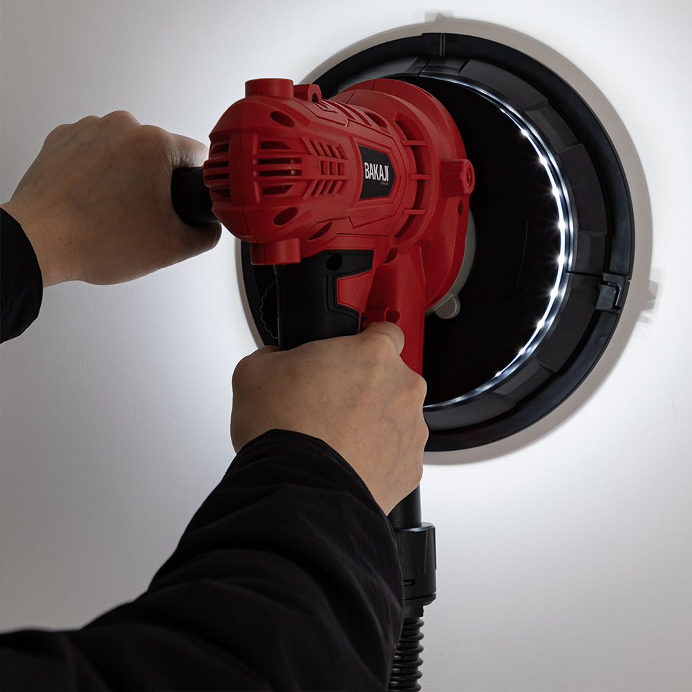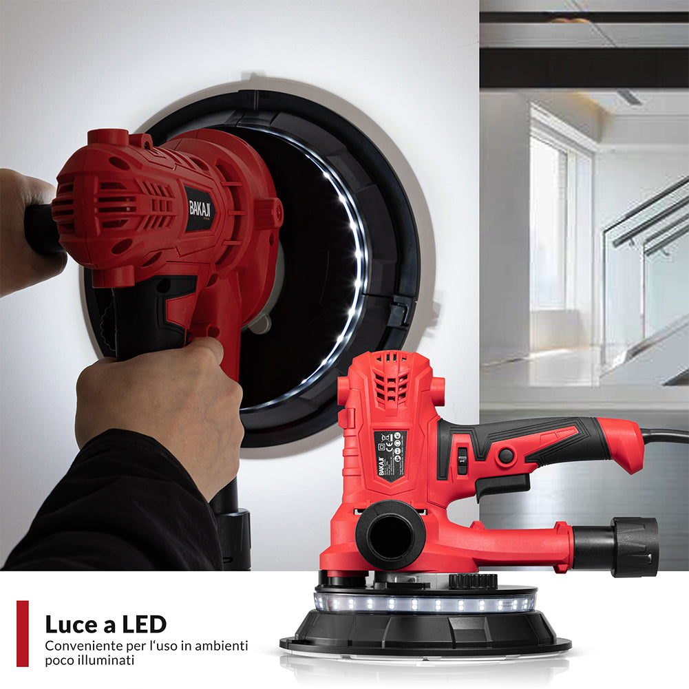 La levigatrice per cartongesso di BAKAJI è dotata di una particolare testa ergonomica che rende più facile l'accesso a qualsiasi angolo e angolazione, raggiungendo con la massima facilità ogni punto della parete, inoltre la luce a LED che circonda la testa della levigatrice illumina l'area circostante a quest'ultima permettendo di lavorare anche in situazioni di scarsa luminosità con il massimo della facilità .