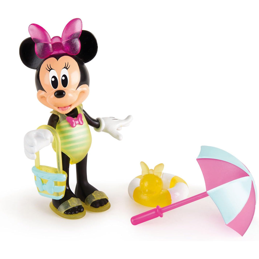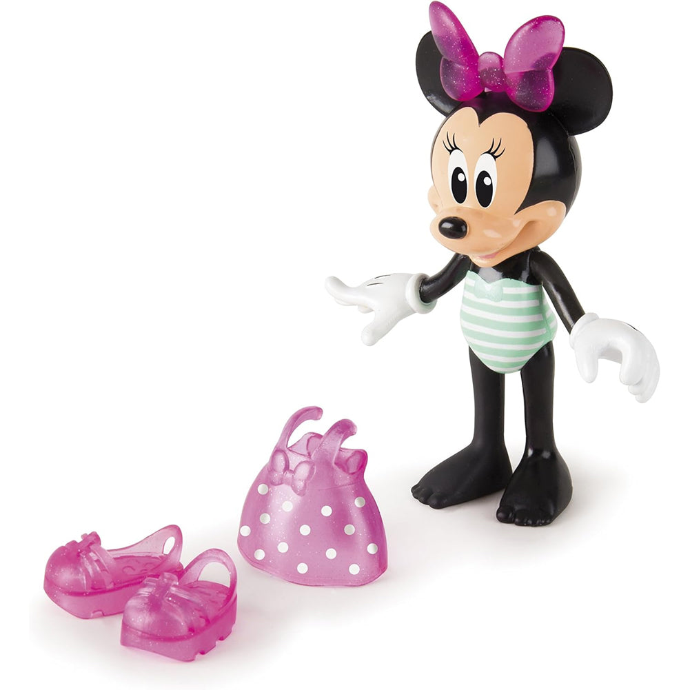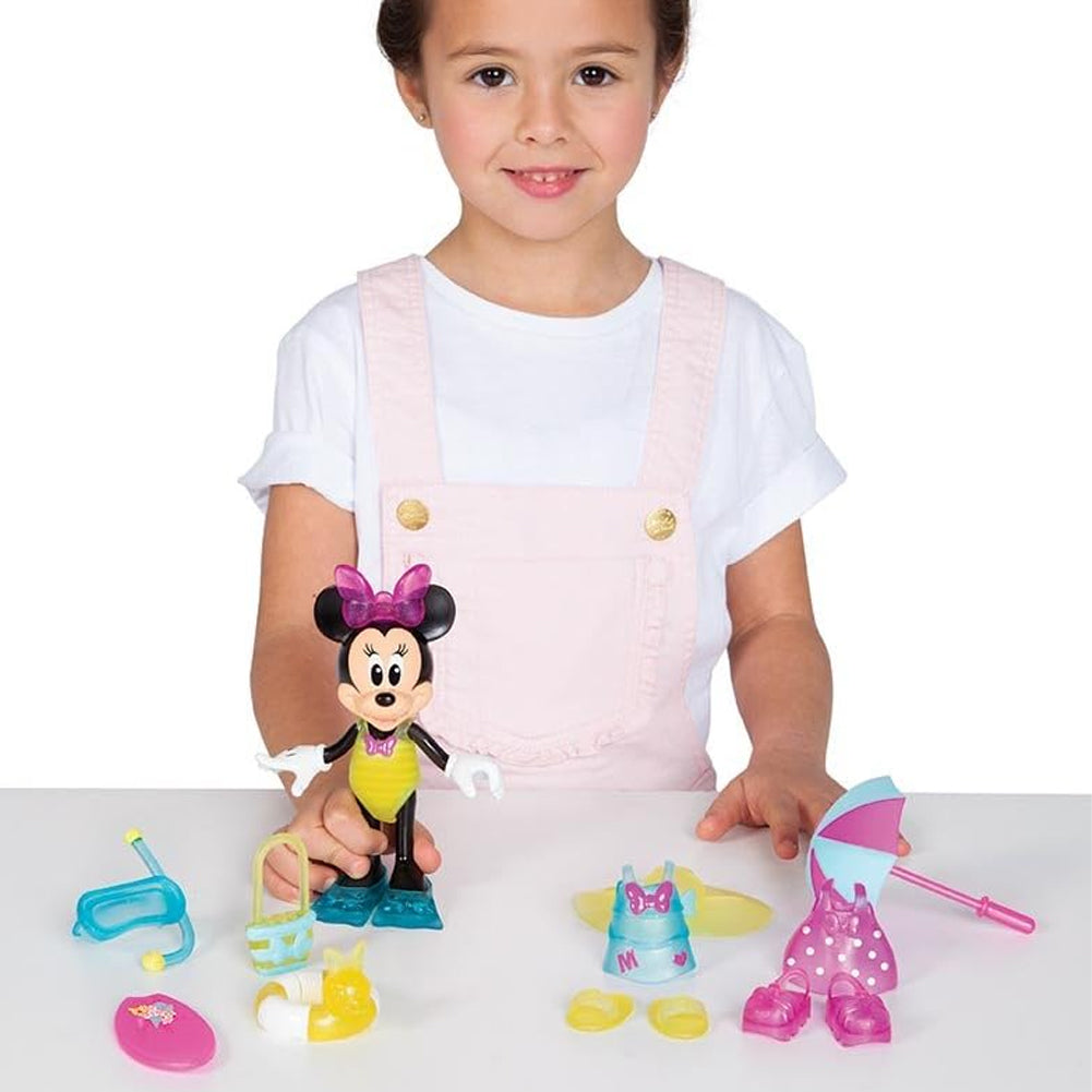 Minnie indossa un grande cappello da sole, occhiali da sole e il suo classico fiocco, pronta a godersi una giornata di divertimento al mare. Ideale per giochi di fantasia ispirati alle giornate in spiaggia.
