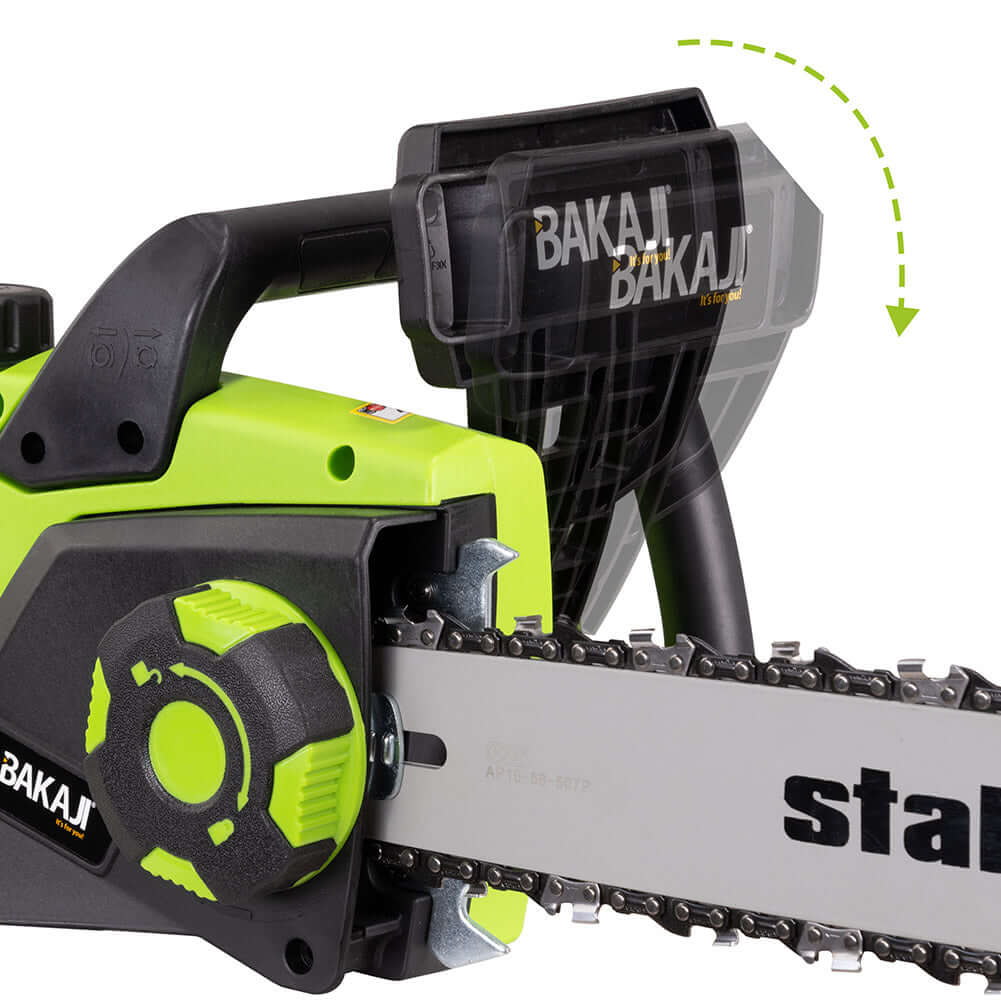 Dotato di doppio interruttore di sicurezza e piastra di spinta del freno manuale per un utilizzo dell motosega in totale sicurezza. Prima di avviare la motosega, assicurarsi che il freno meccanico sia rilasciato, altrimenti l'attrezzo non si avvierà