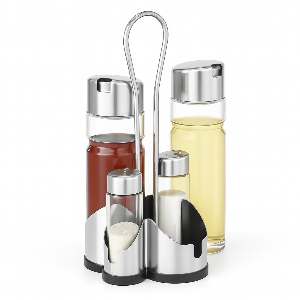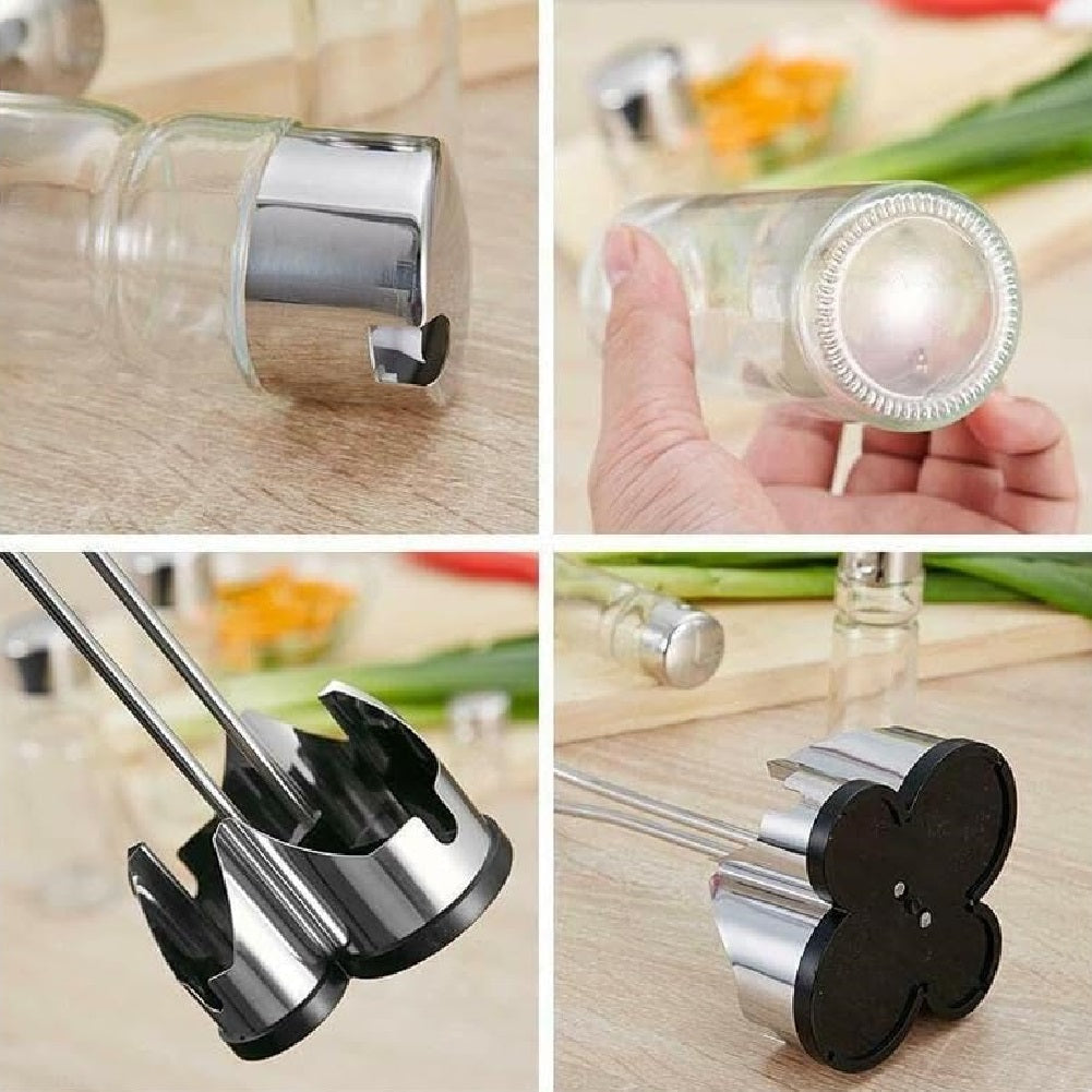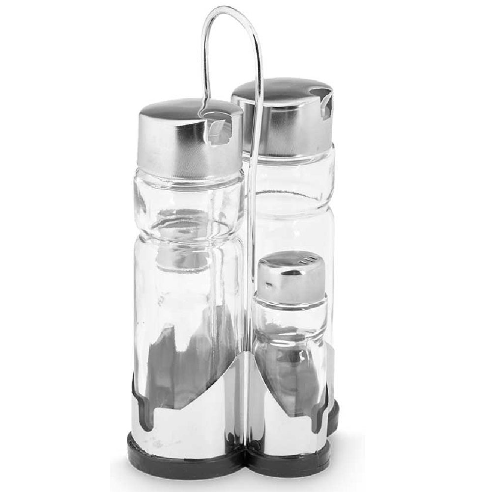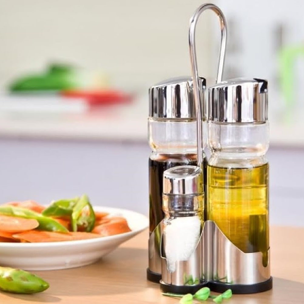 Oliera Acciaio e Vetro 4 pezzi Cucina Porta Olio Aceto Sale Pepe con Supporto