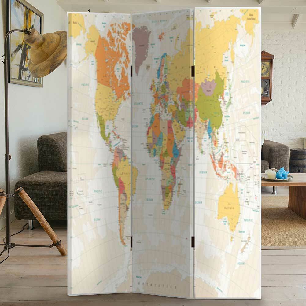Paravento Separe 3 Pannelli Con Stampa Fronte Retro Mappamondo Divisorio 180x120