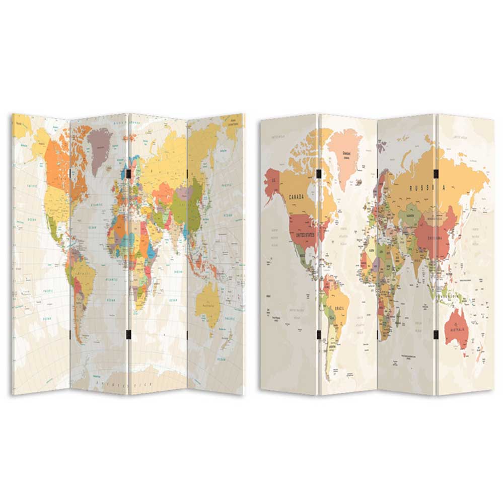 Paravento Separe 4 Pannelli Con Stampa Fronte Retro Mappamondo Divisorio 180x160