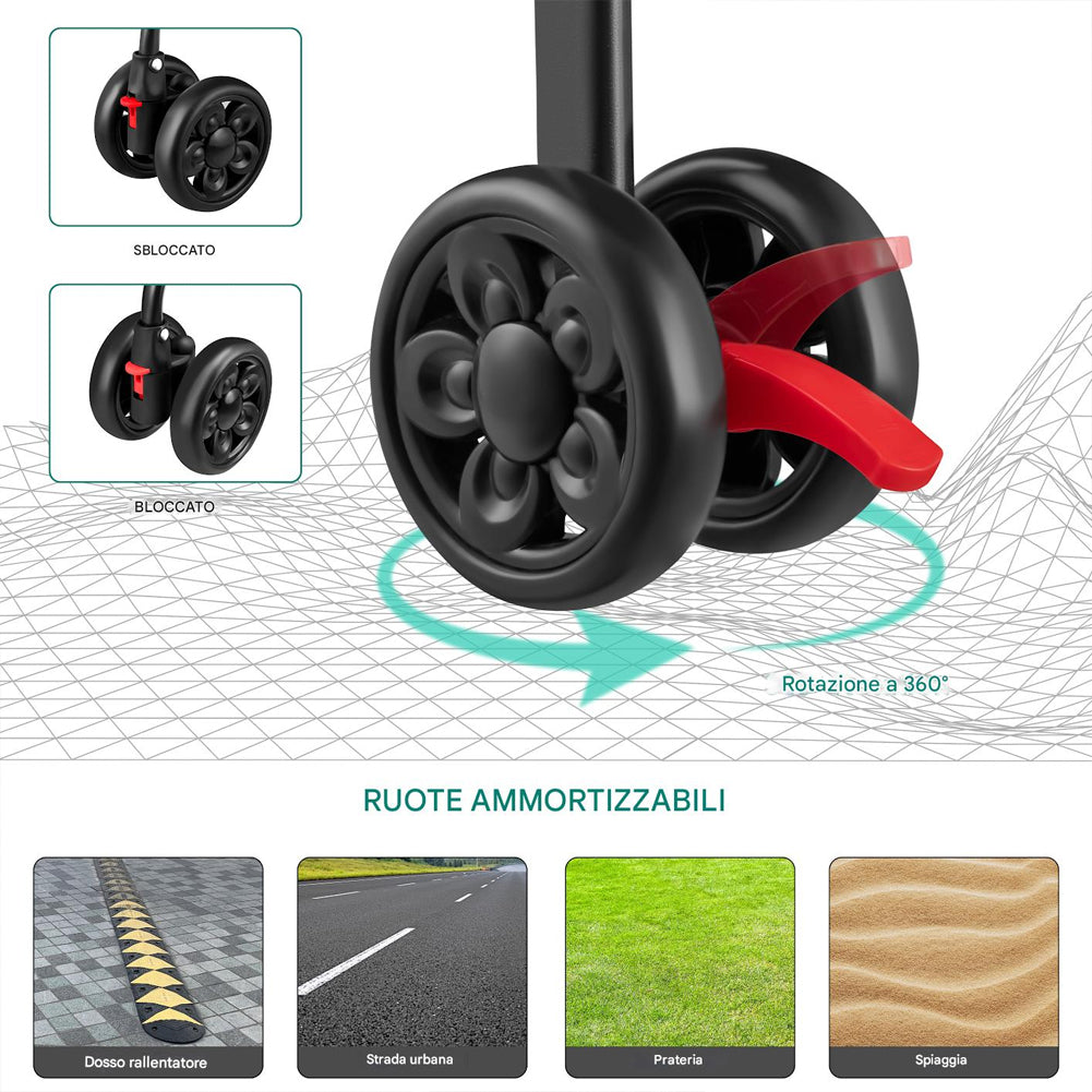 Le ruote in schiuma EVA da 4,5 pollici offrono una guida silenziosa e fluida su superfici urbane come asfalto e marciapiedi.