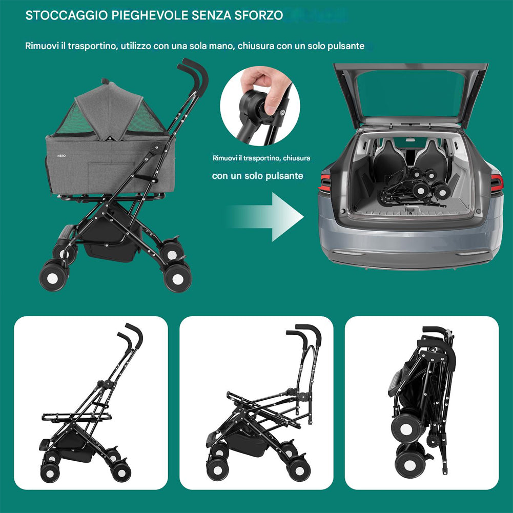 Questo passeggino per animali è dotato di una barra di traino ergonomica che ti consente di utilizzarlo non solo come classico stroller ma anche come rimorchio a mano, rendendolo ideale per escursioni più lunghe, fiere, o situazioni dove spingere non è comodo. La versatilità è il suo vero punto di forza.