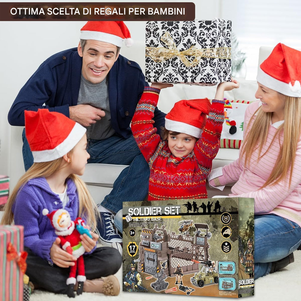 Set militare completo da 17 pezzi – Include soldatini, veicoli da combattimento, armi, accessori e strutture militari.