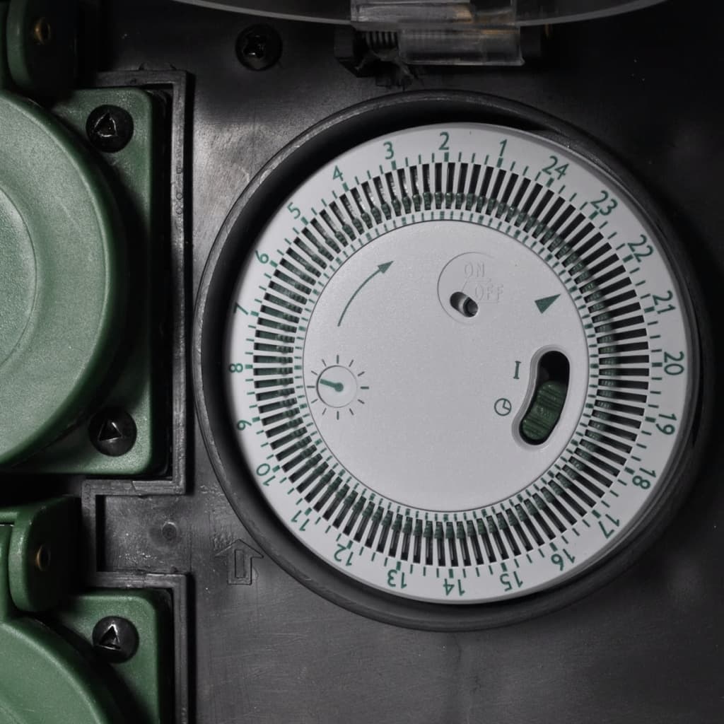 Dispone di due prese e di un timer meccanico nascosto in un alloggiamento in resina finta pietra. Il timer meccanico spegne automaticamente gli elettrodomestici. La porta magnetica e i coperchi protettivi caricati a molla sono molto convenienti.