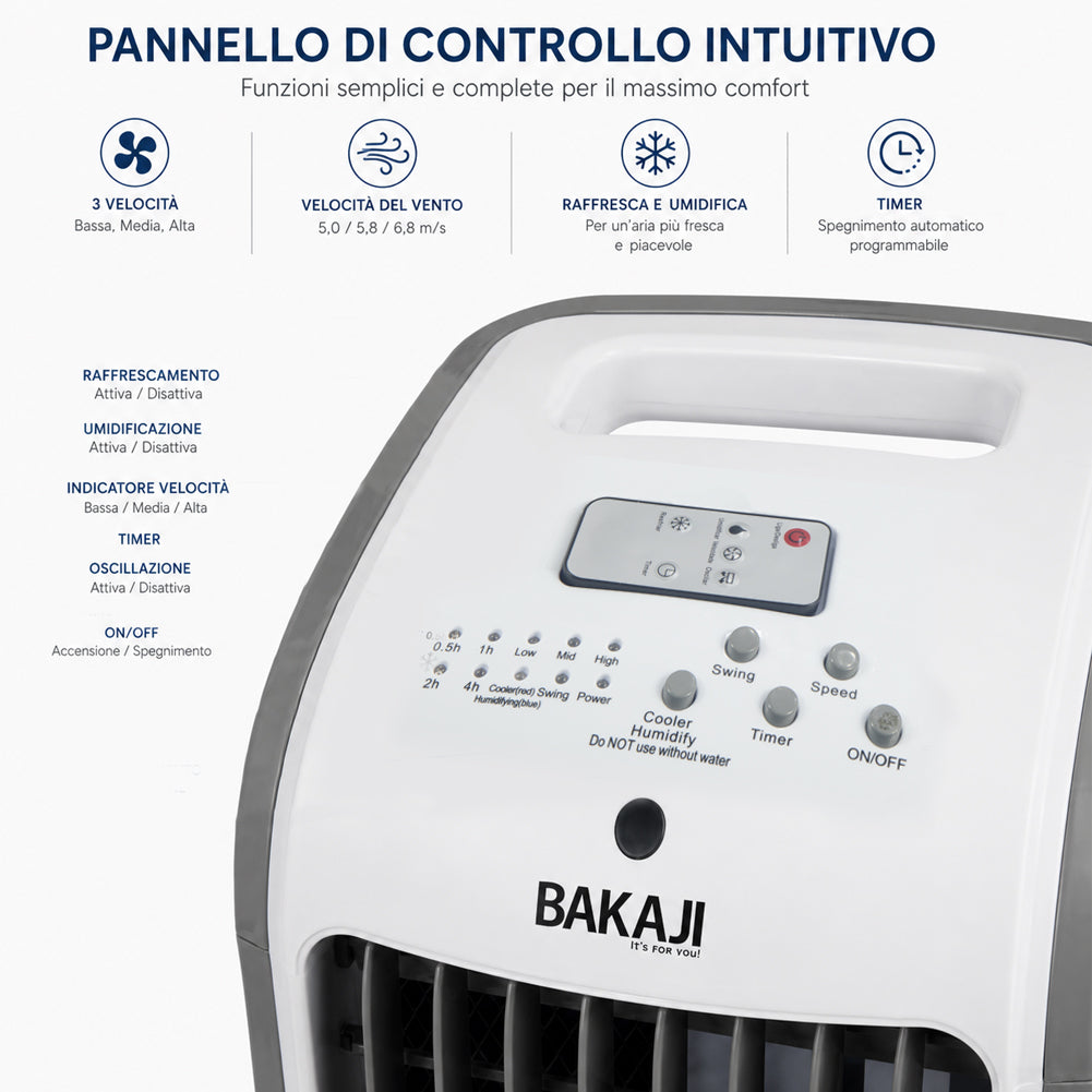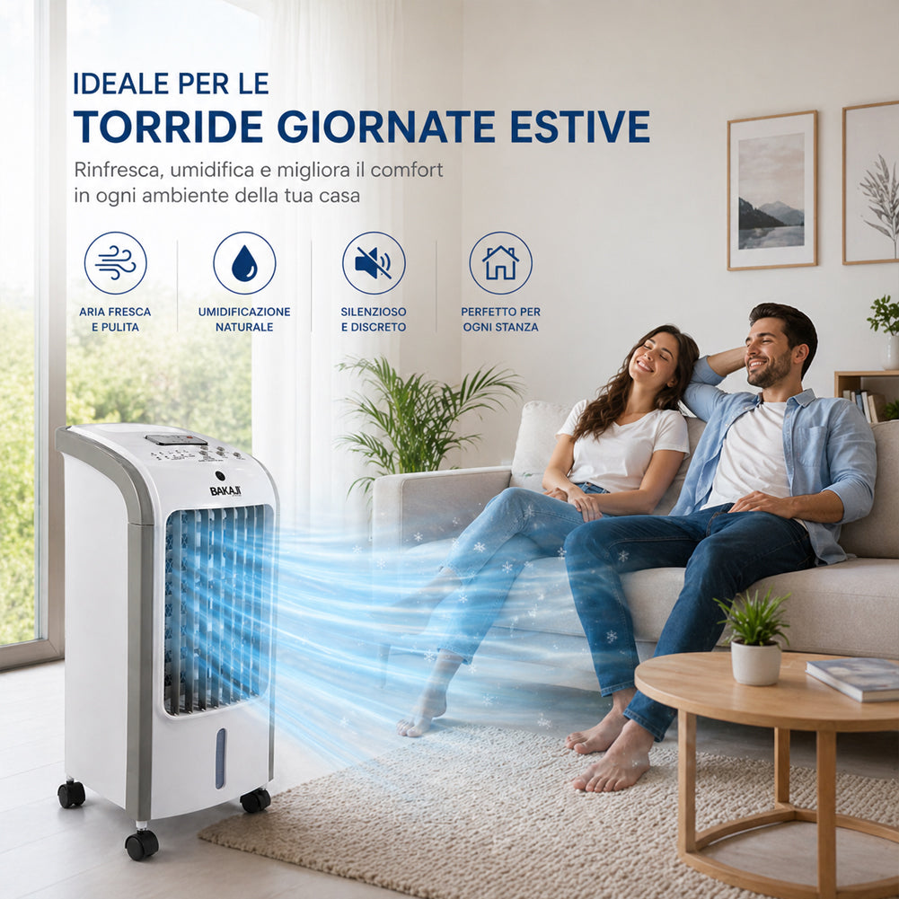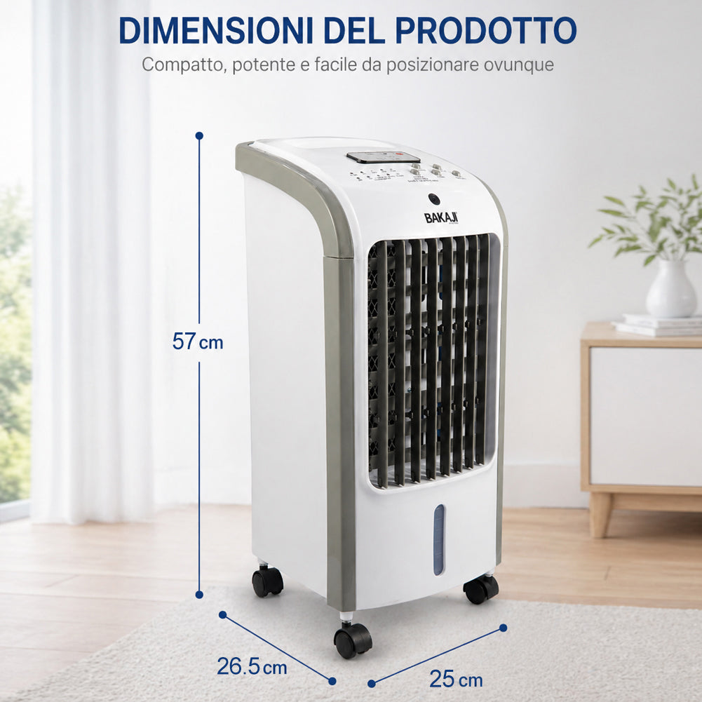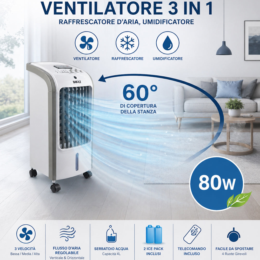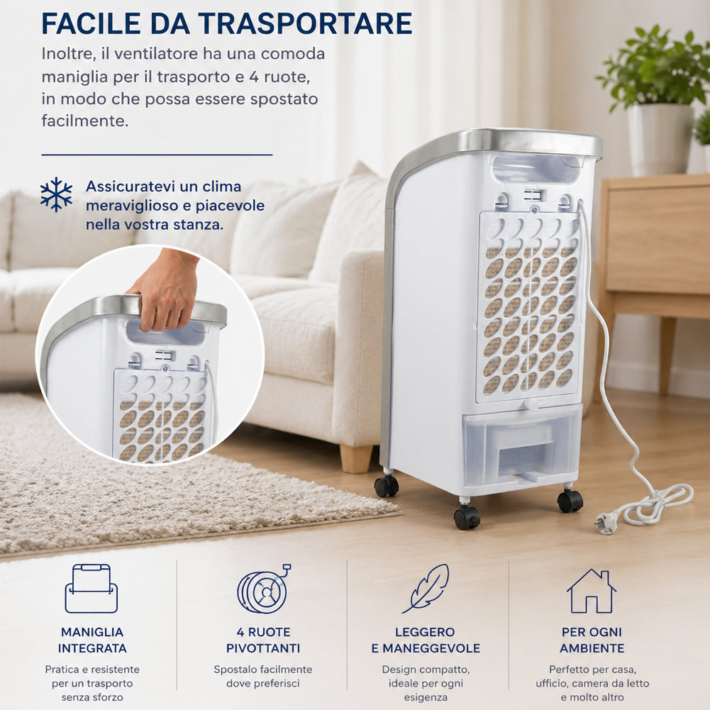 Ventilatore, raffrescatore d’aria e umidificatore in un unico dispositivo da 80W, ideale per migliorare il comfort negli ambienti domestici durante le giornate più calde.