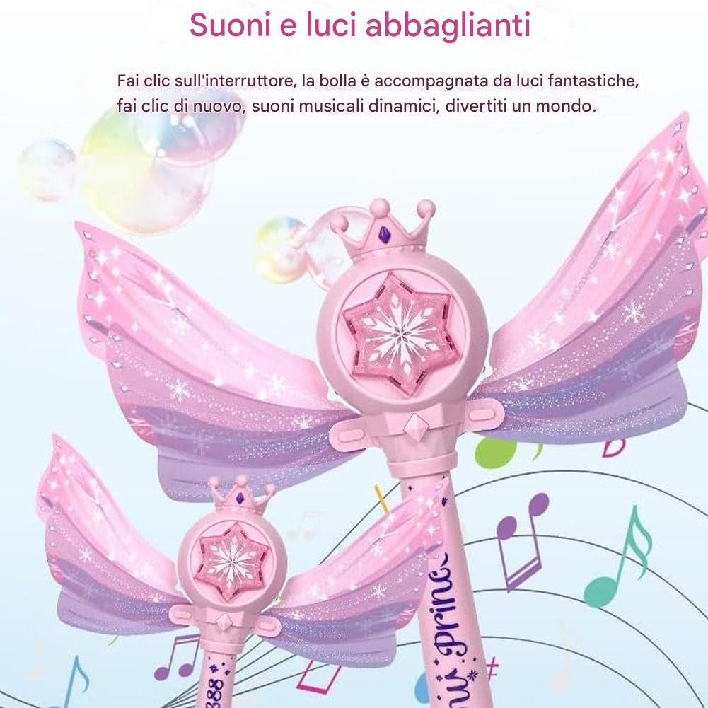 Luci Colorate e Musica Divertente: La bacchetta non si limita a creare bolle, ma illumina il gioco con effetti luminosi lampeggianti e suoni musicali allegri.