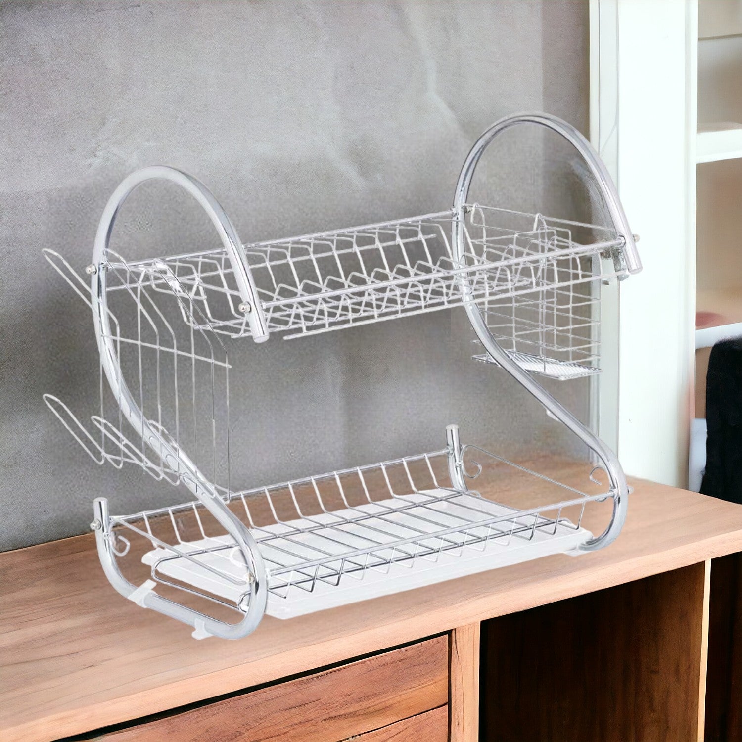 Scolapiatti a 2 Livelli in Metallo Cromato con Vassoio bianco