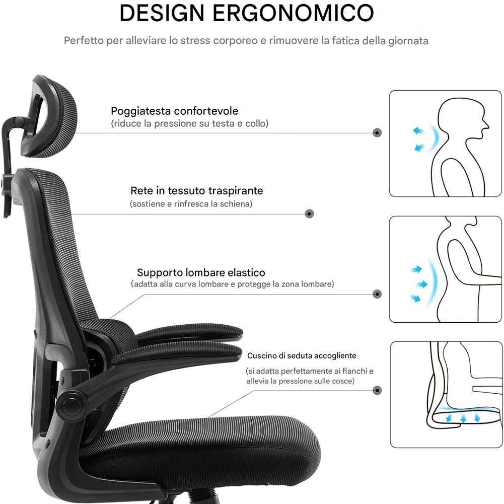 Sedia da Ufficio Ergonomica Nera Rete Traspirante Supporto Lombare e Poggiatesta