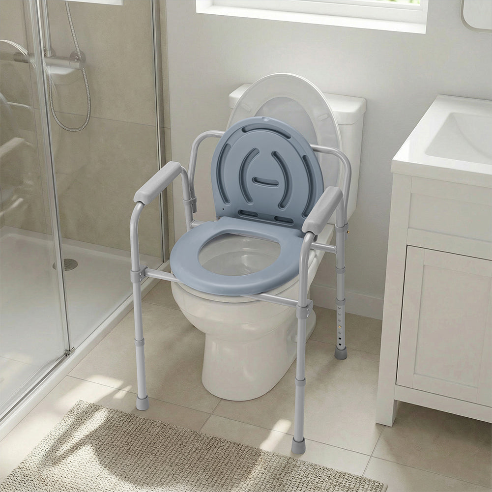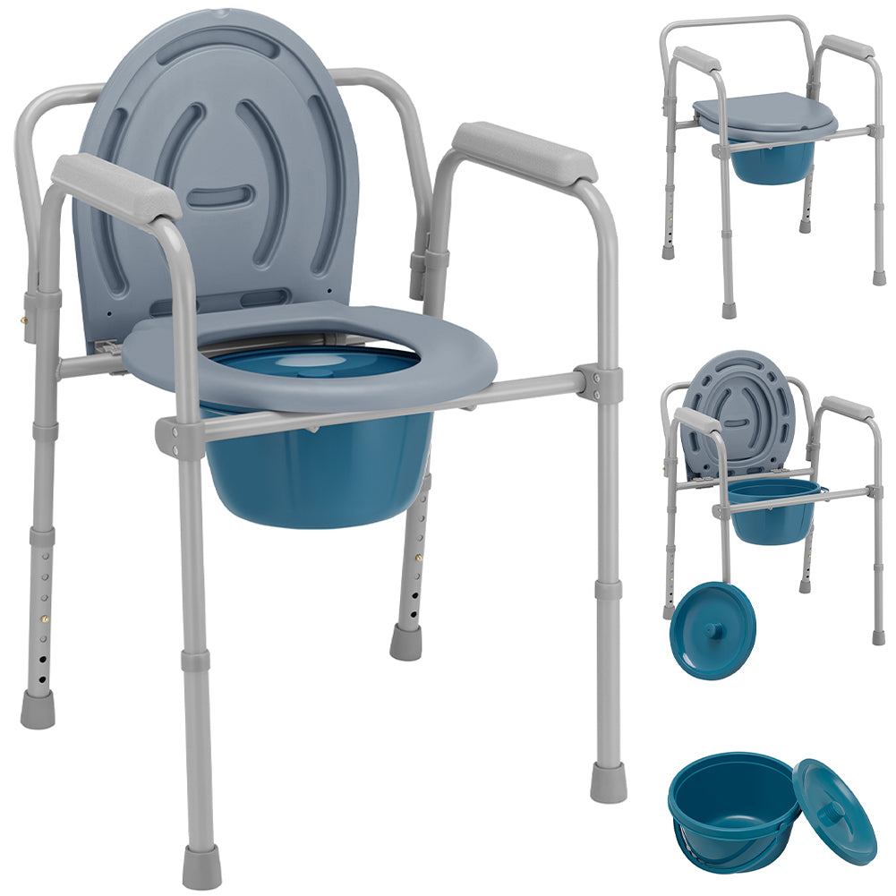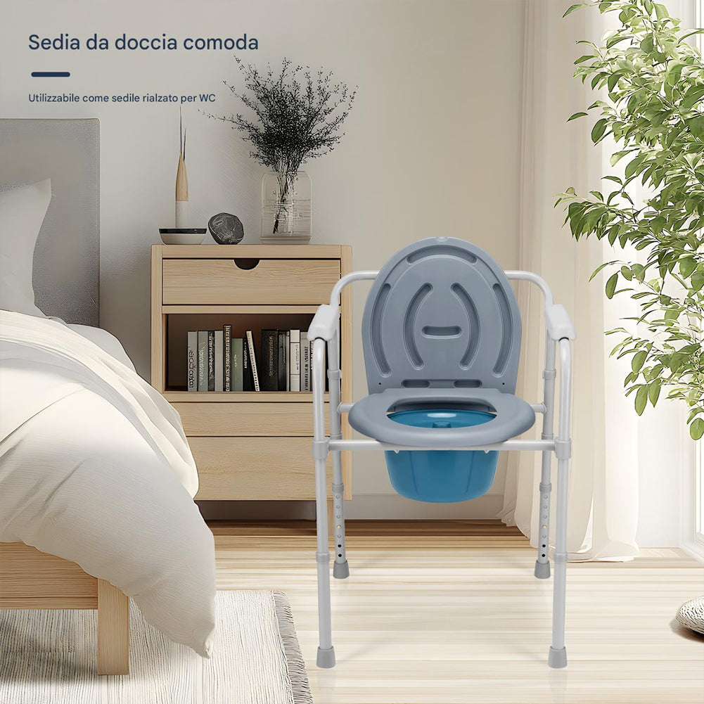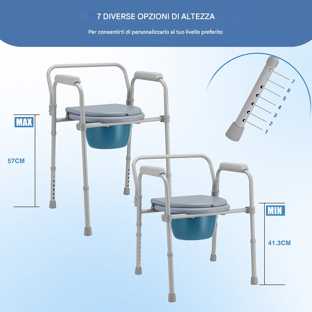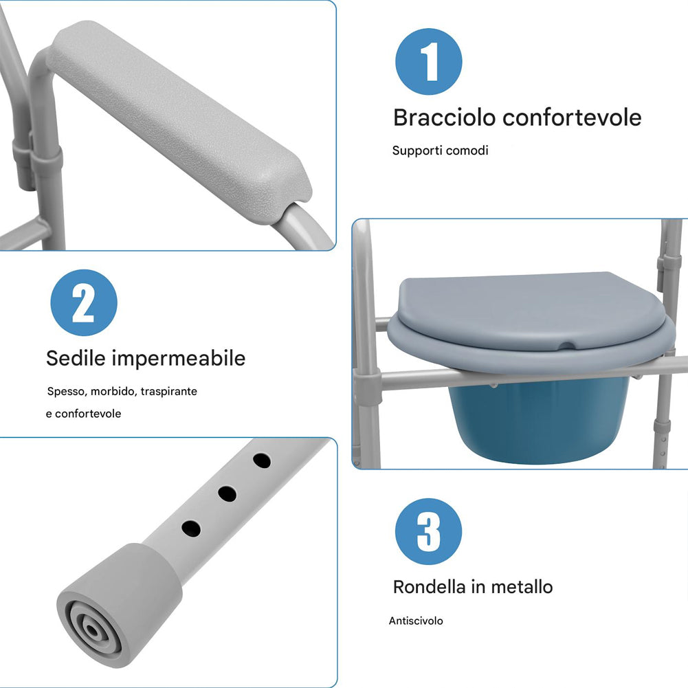 Pratica sedia WC portatile progettata per offrire comfort e sicurezza a persone anziane, con mobilità ridotta o durante la convalescenza.