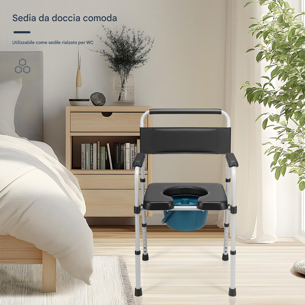 Il sistema consente un utilizzo igienico e pratico della sedia WC direttamente in camera o in bagno, offrendo una soluzione comoda e discreta per le esigenze quotidiane di assistenza.