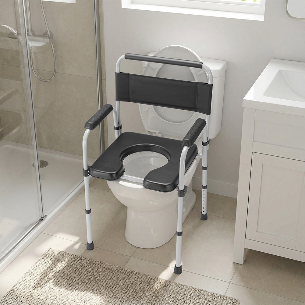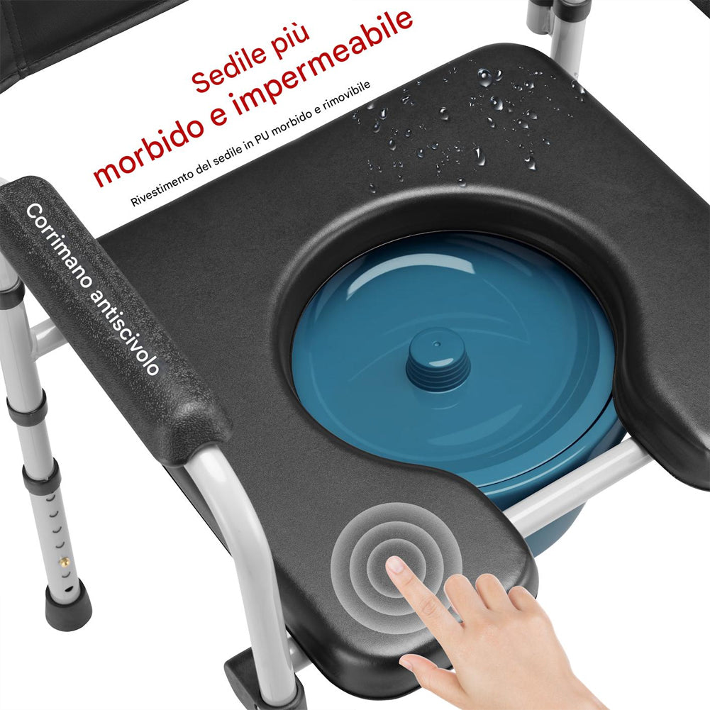 I braccioli imbottiti e lo schienale di supporto garantiscono maggiore comfort e sicurezza durante l’utilizzo, facilitando sia la seduta che l’alzata in modo stabile e controllato.