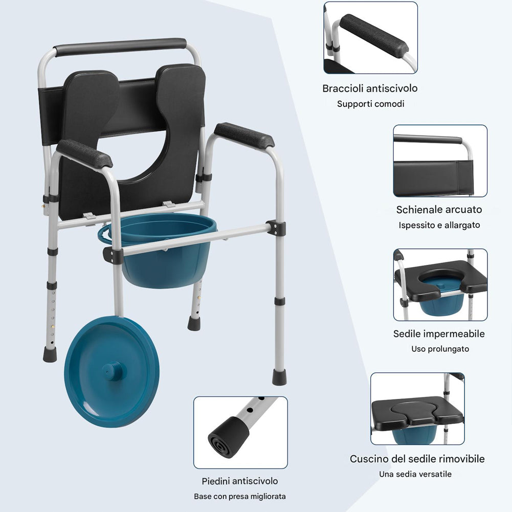 Sedia comoda WC realizzata con solida struttura in tubolare di ferro da 1 mm con rivestimento a polvere anticorrosione, progettata per garantire stabilità e resistenza nel tempo.