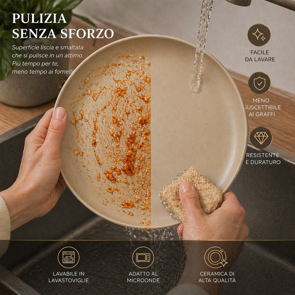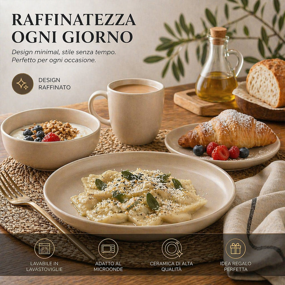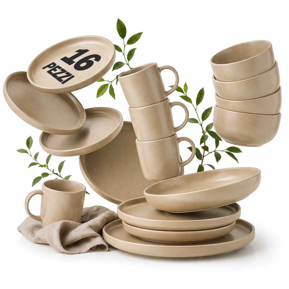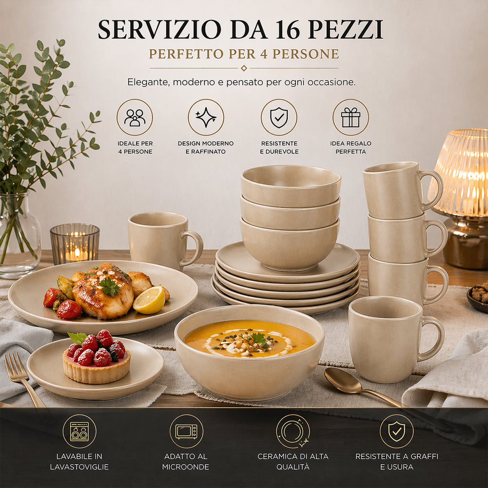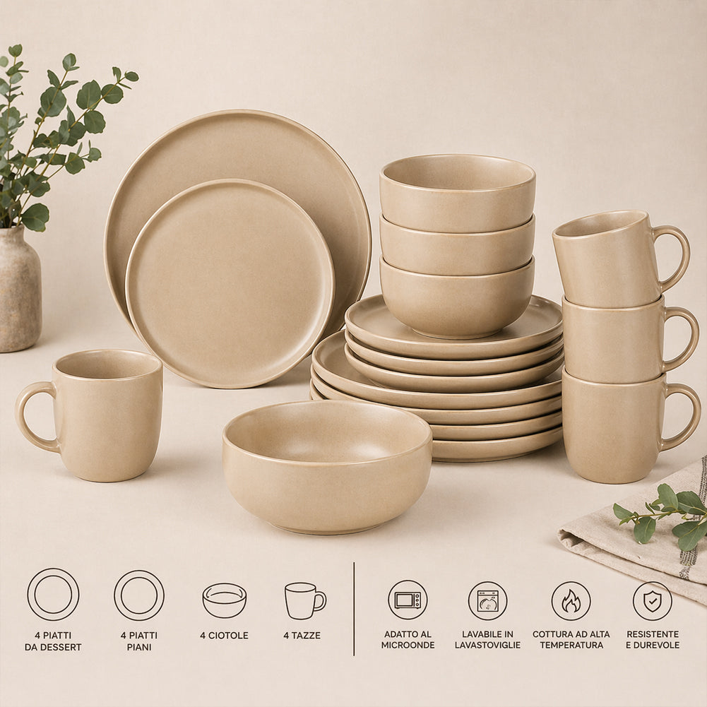 1 x Servizio Piatti da 16 Pezzi Sabbia per 4 Persone in Gres Smaltato Design Moderno