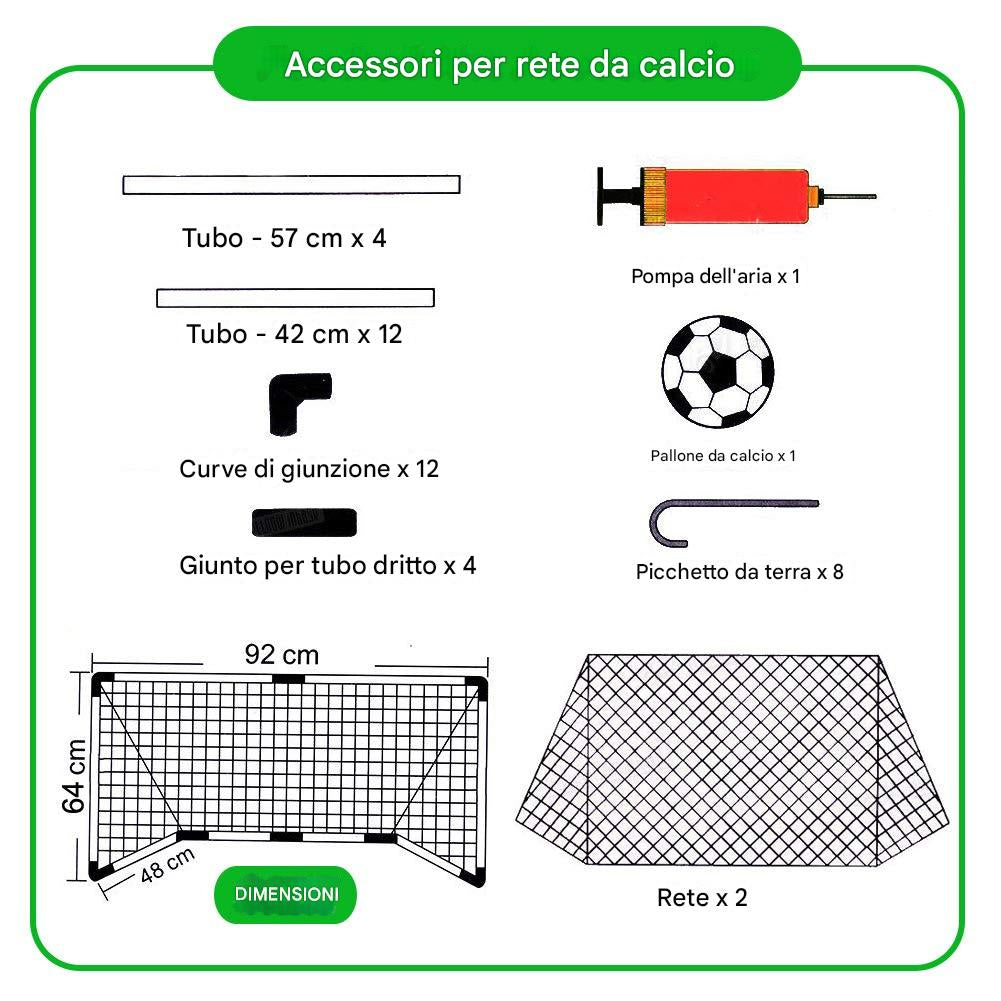 Set da calcio completo composto da 2 porte con rete resistente, pallone incluso, pompa manuale con ago per gonfiaggio e morsetti per fissaggio al terreno.