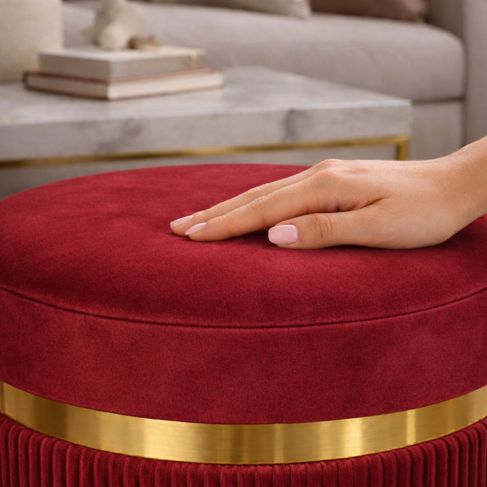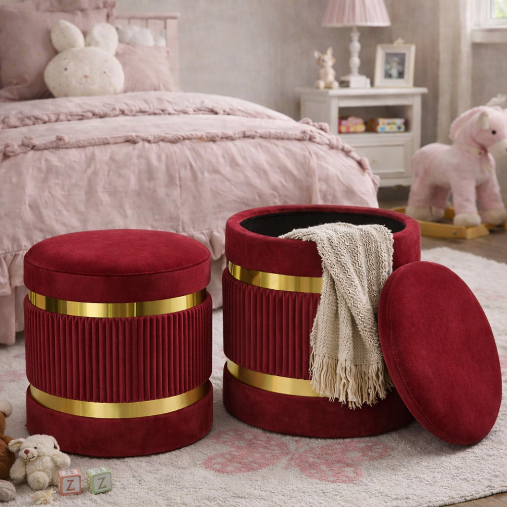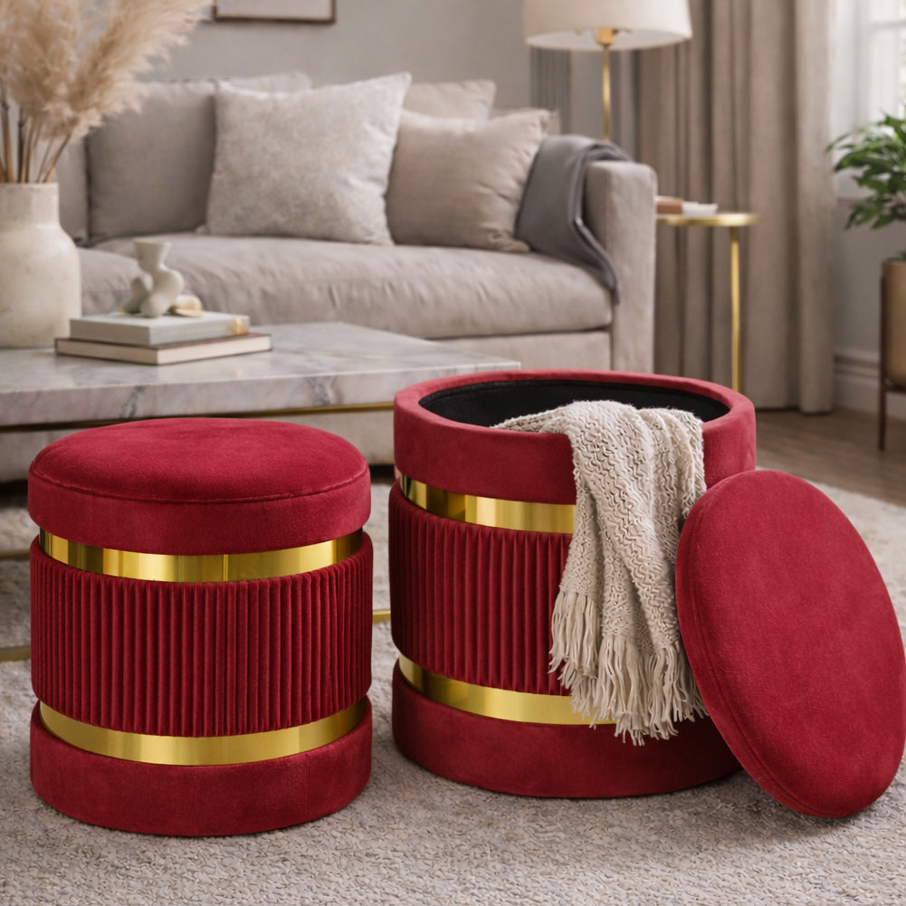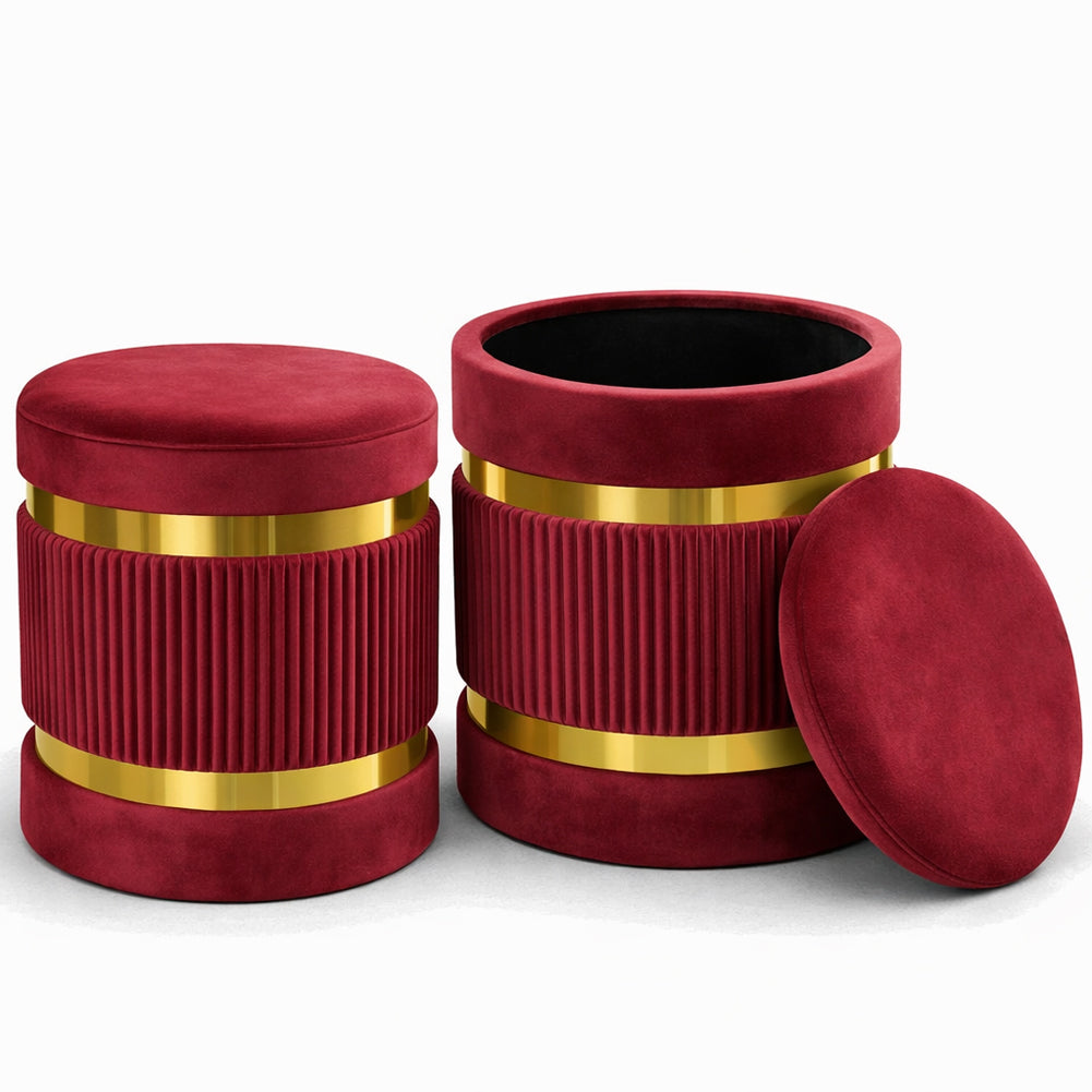 1 x Set 2 Pouf Contenitore Bordeaux con Rivestimento Velluto Morbido Sgabelli Moderni