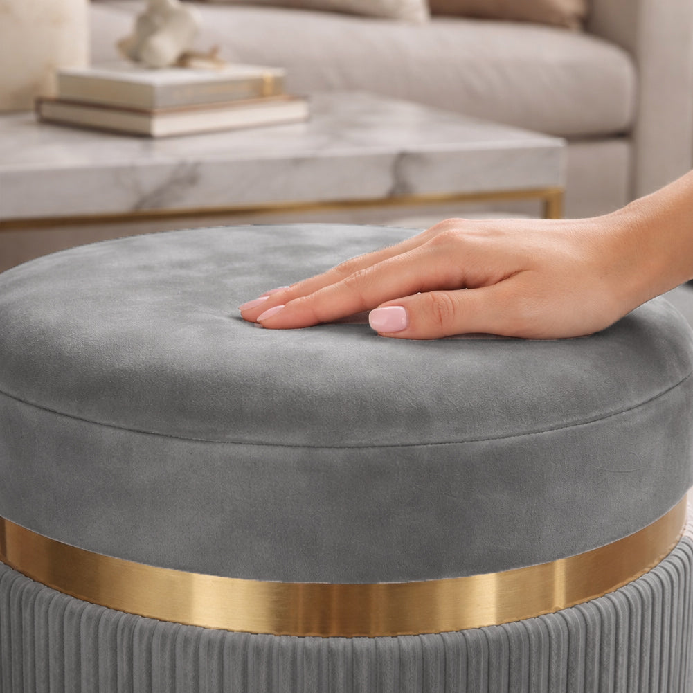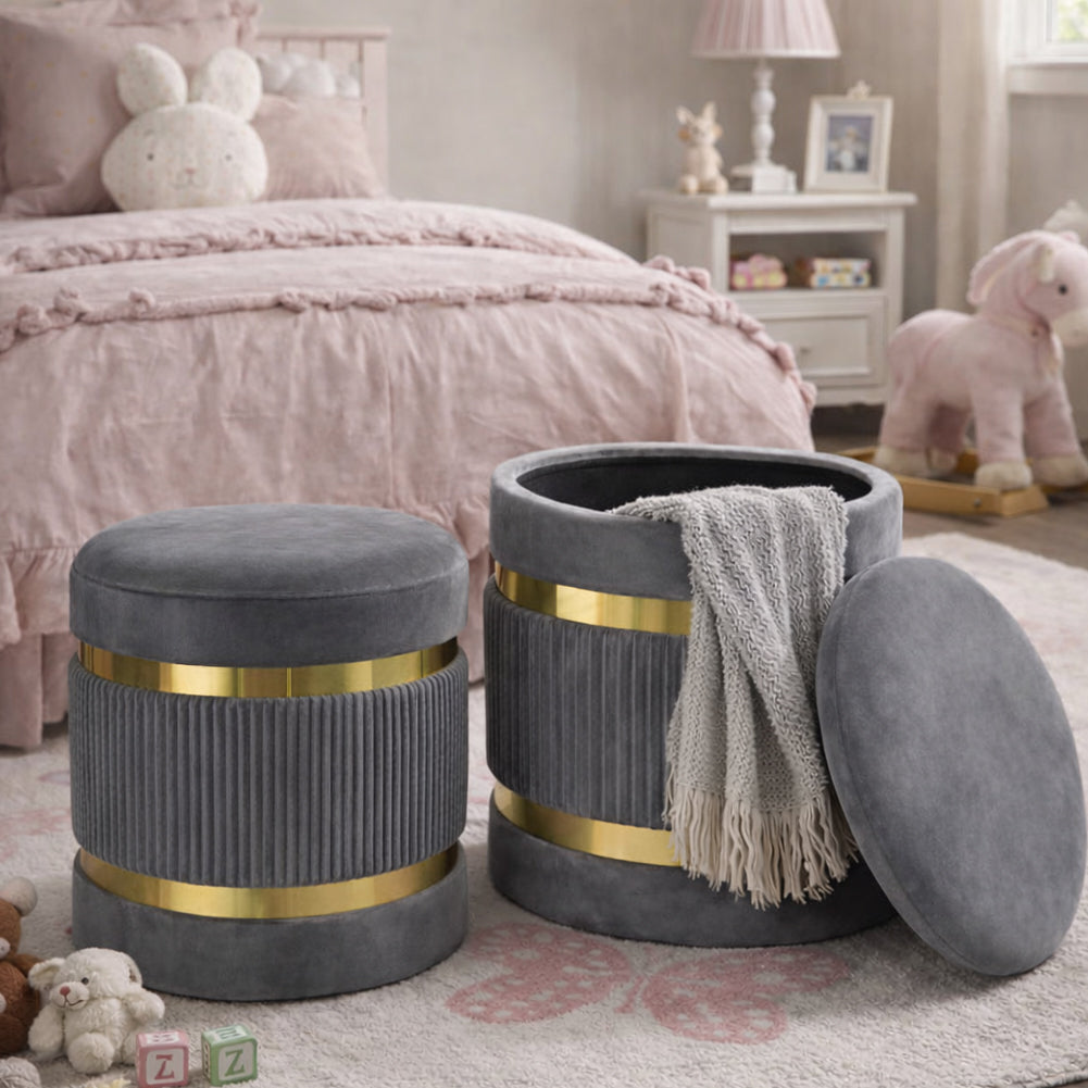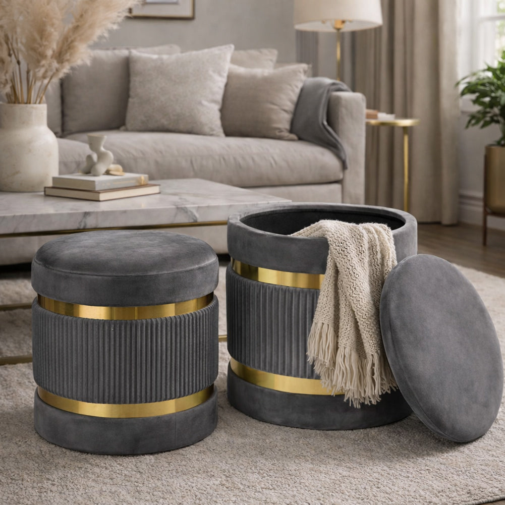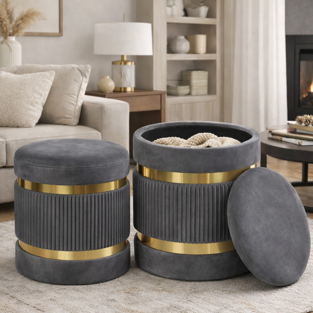 1 x Set 2 Pouf Contenitore Grigio con Rivestimento Velluto Morbido Sgabelli Moderni