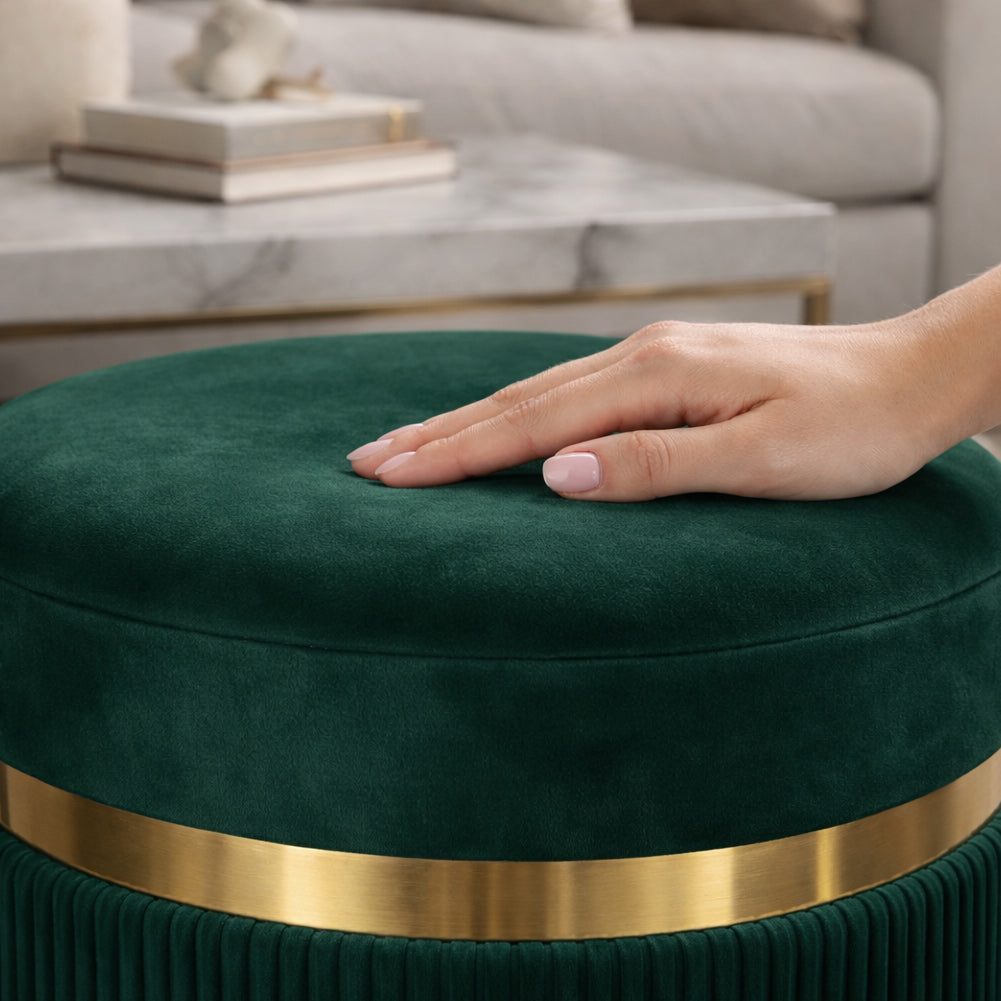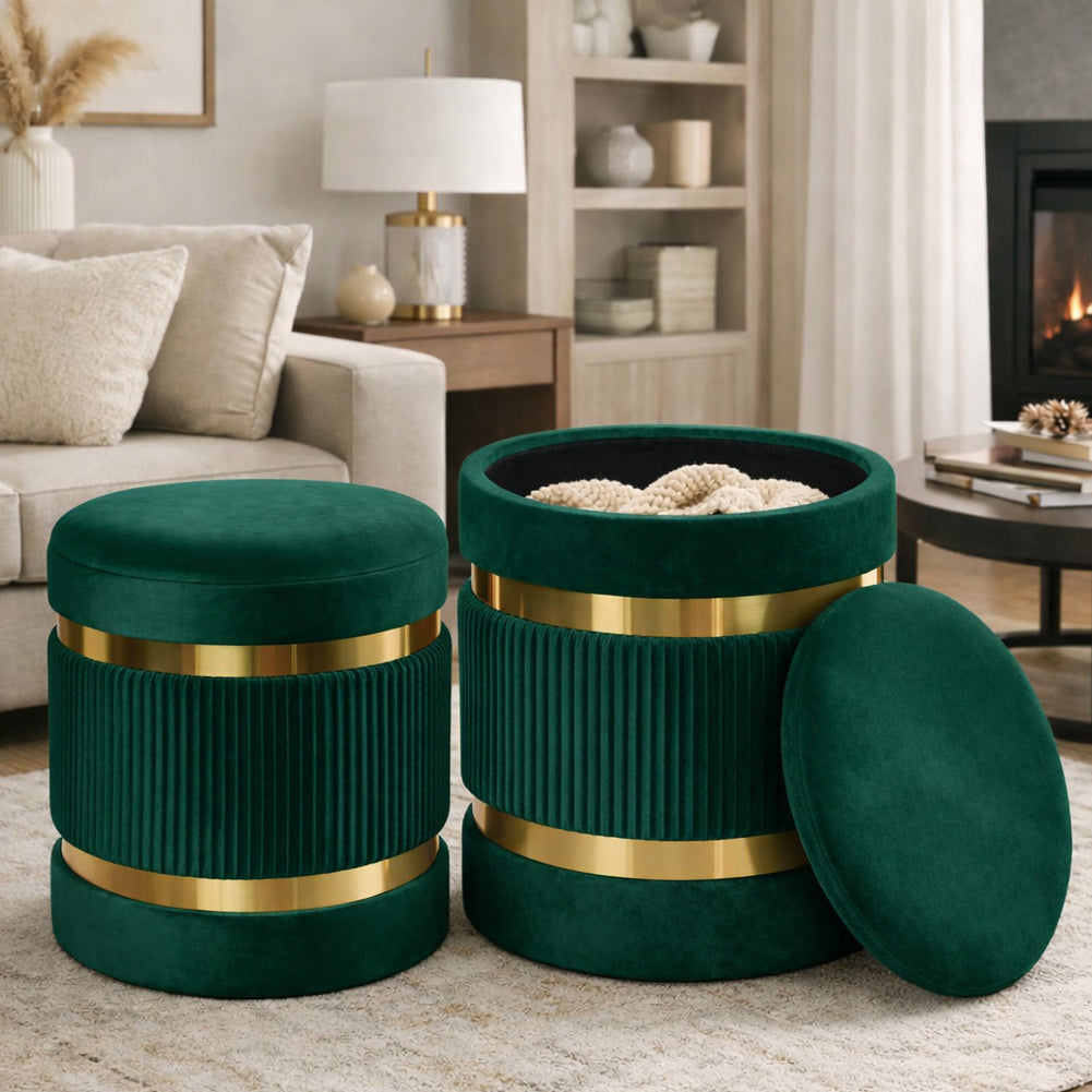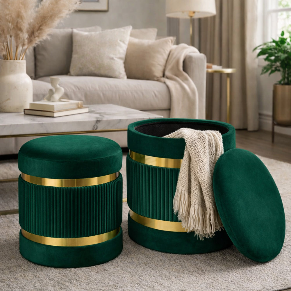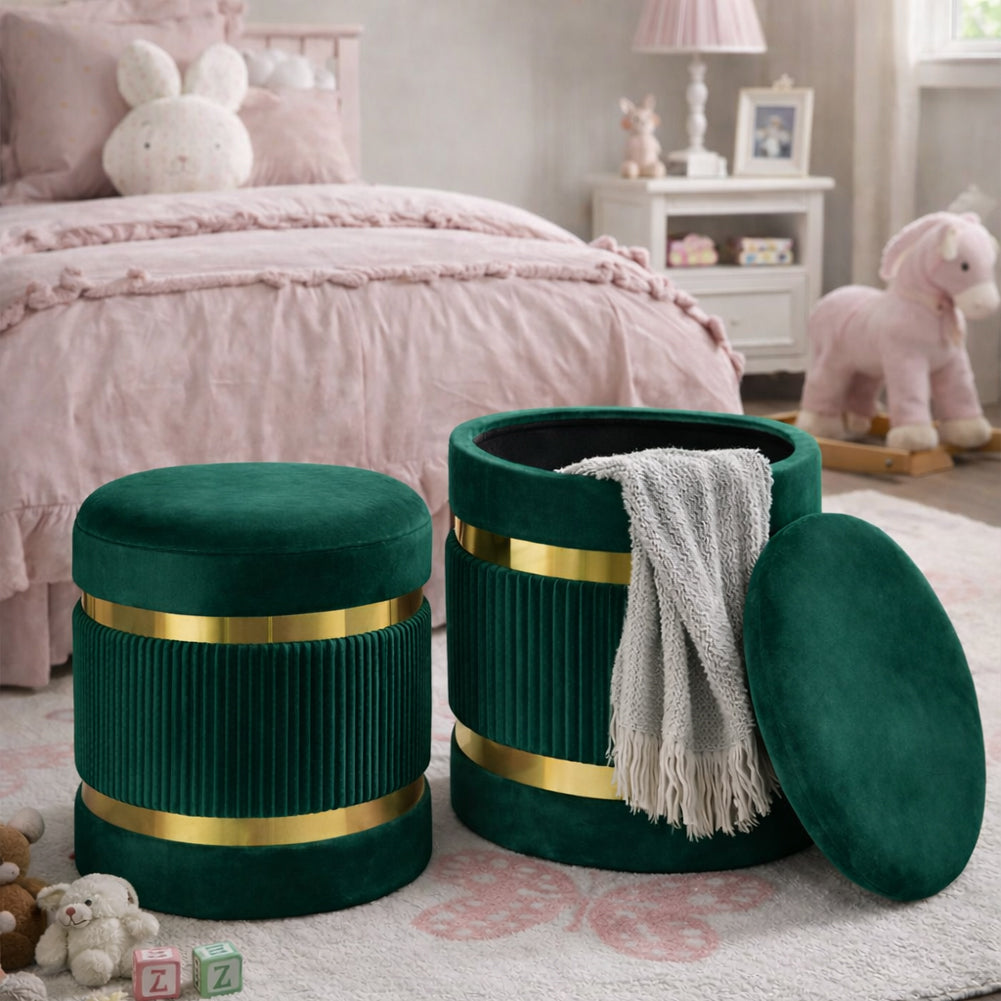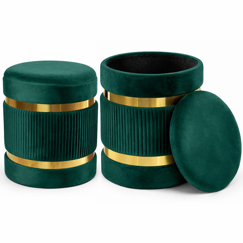 1 x Set 2 Pouf Contenitore Verde con Rivestimento Velluto Morbido Sgabelli Moderni